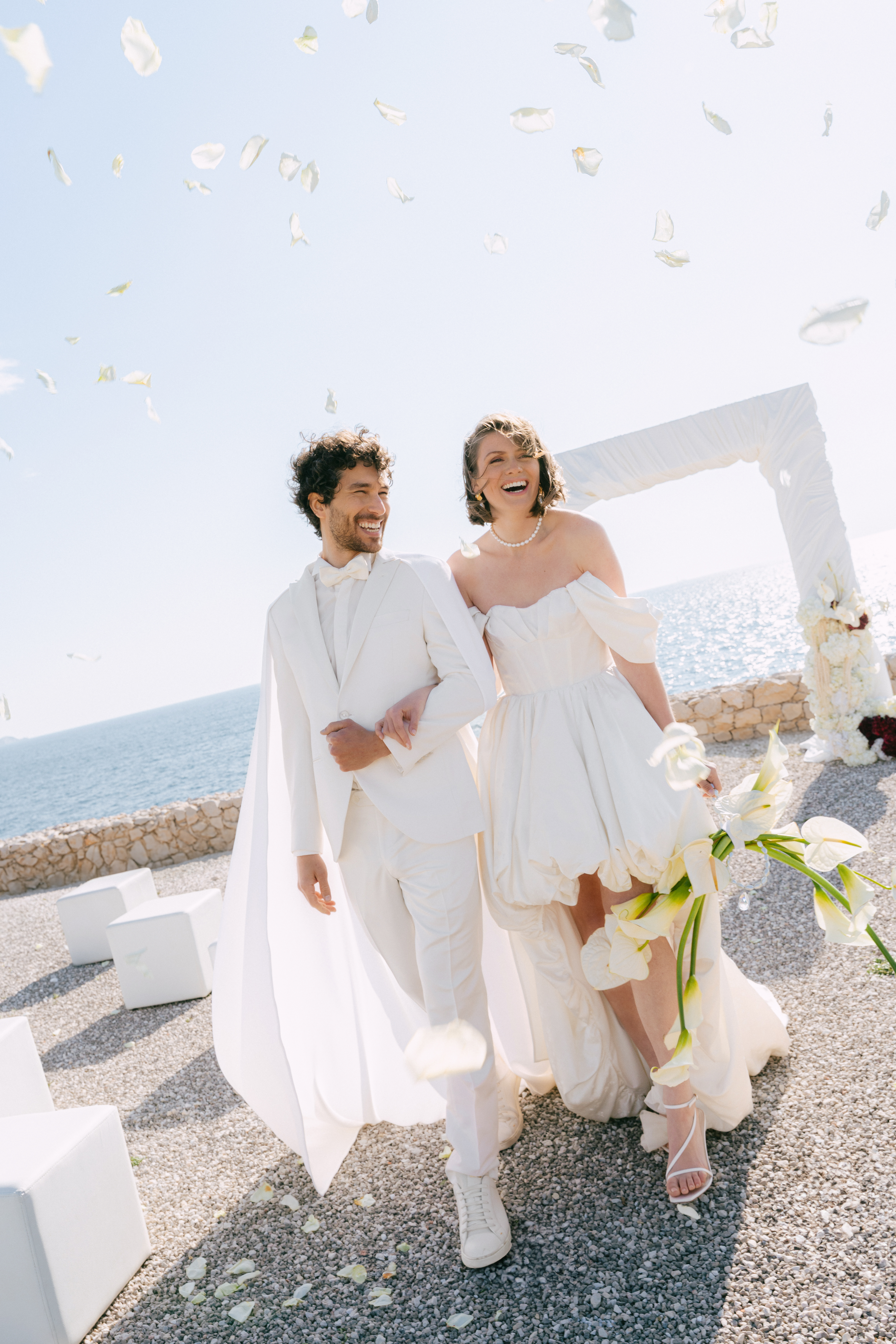 The inspiration for this shoot came from a desire to fuse two seemingly opposing forces: the modern elegance of the anthurium flower with the raw, untamed beauty of the Mediterranean Sea. The anthurium, with its striking, almost sculptural form, was chosen as the centerpiece for the design, representing strength, beauty, and sophistication. The contrast between the delicate petals of the flower and the wildness of the sea captures the very essence of love — delicate yet powerful, fragile yet eternal. In this shoot, the island itself became a symbol of the many facets of love: passionate, calm, strong, and enduring.