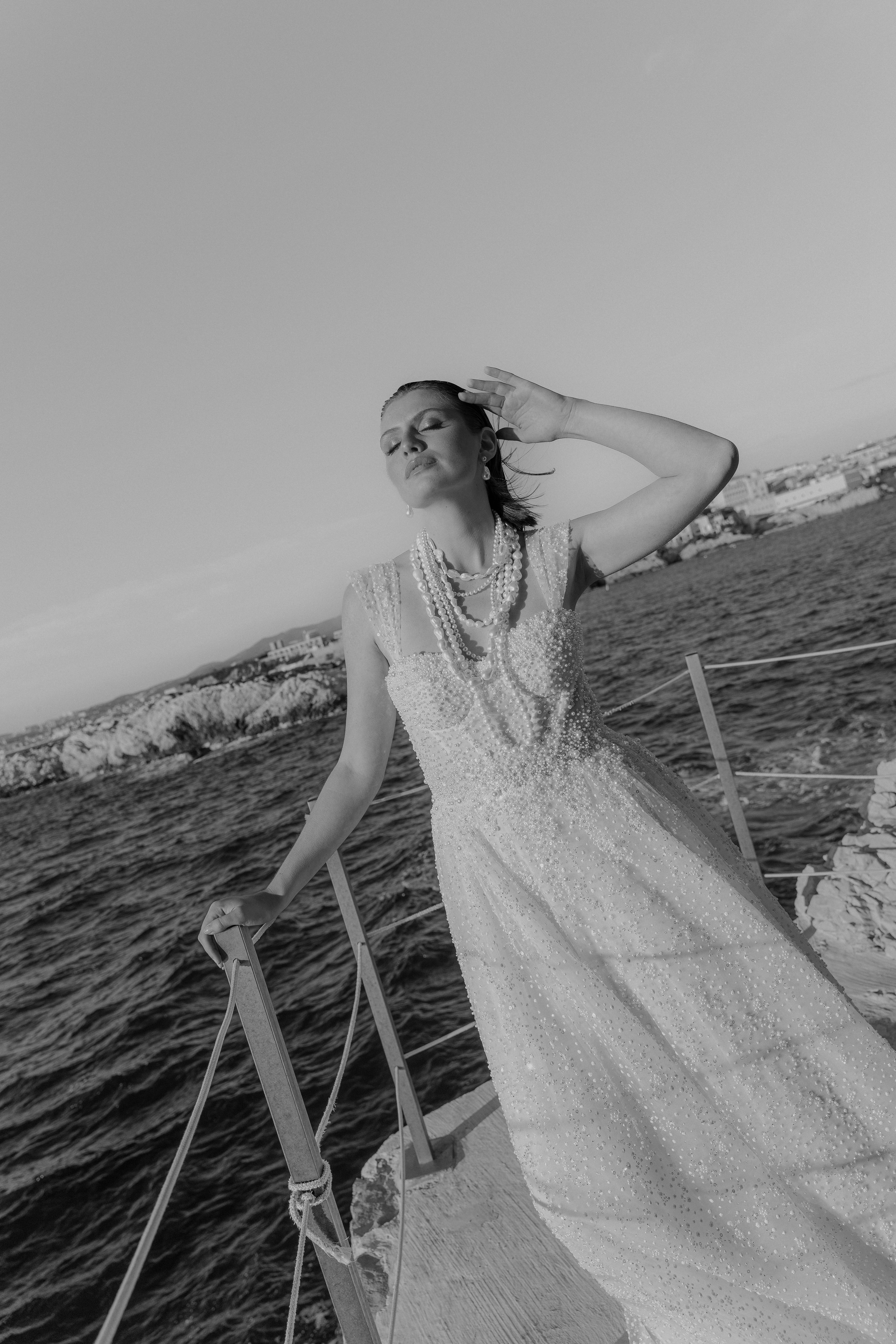 For the bride and groom, fashion was central to the shoot’s narrative. The bride, draped in Rime Arodaky’s beautiful gown, embodied modern bridal elegance. Her dress, with its fluid lines and romantic flair, captured the ethereal beauty of a timeless love story. Sonia B. Marseille’s evening gown mirrored the soft power of the island itself, its structure representing strength and grace, a perfect complement to the bride’s character. Espace Homme Cérémonie dressed the groom in a sharply tailored suit, his sophisticated look exuding confidence and elegance, making him the perfect counterpart to the bride’s beauty.