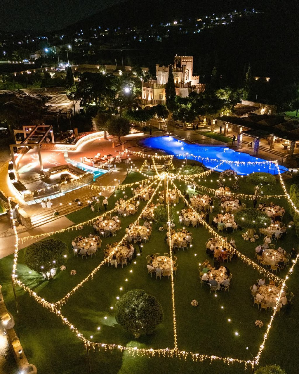 Tucked among rolling hills near Athens, Hatzi Mansion brings together neoclassical beauty and warm Mediterranean charm. The estate’s garden unfolds like a painting — blooming terraces, soft fountains, and a stately tower that glows golden at sunset. Every celebration here feels enveloped in quiet sophistication and heart.