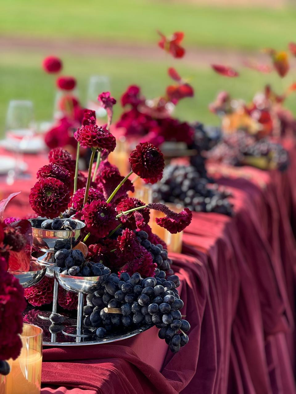 - Tablescapes: Layer your tables in rich burgundy linens, then build upwards with textures: cascading amaranth, dark dahlias, and glossy grapes spilling over metal or wooden trays. Silver or antique metallic elements balance the deep colors, preventing the look from becoming too heavy.