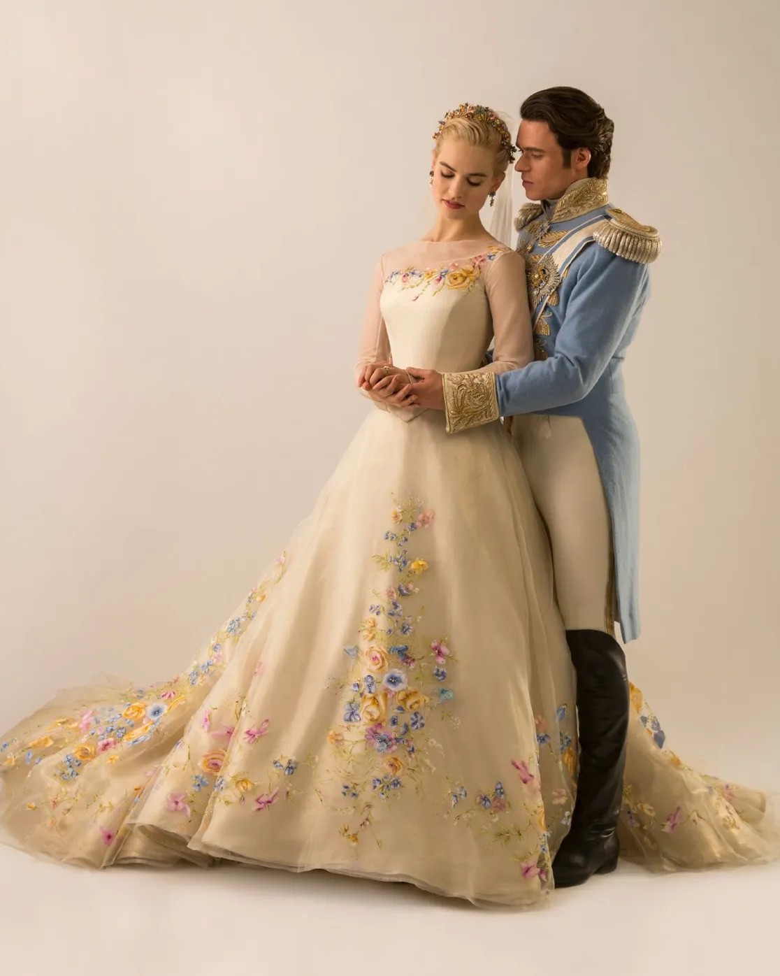 This gown didn’t just belong in a fairytale — it became the fairytale. For Lily James’s Cinderella, costume designer Sandy Powell created a wedding dress that felt like springtime woven into silk. Instead of heavy embellishments, the beauty came from the details: hand-painted floral embroidery, layers of translucent ivory organza, and a soft golden glow that caught every bit of light.