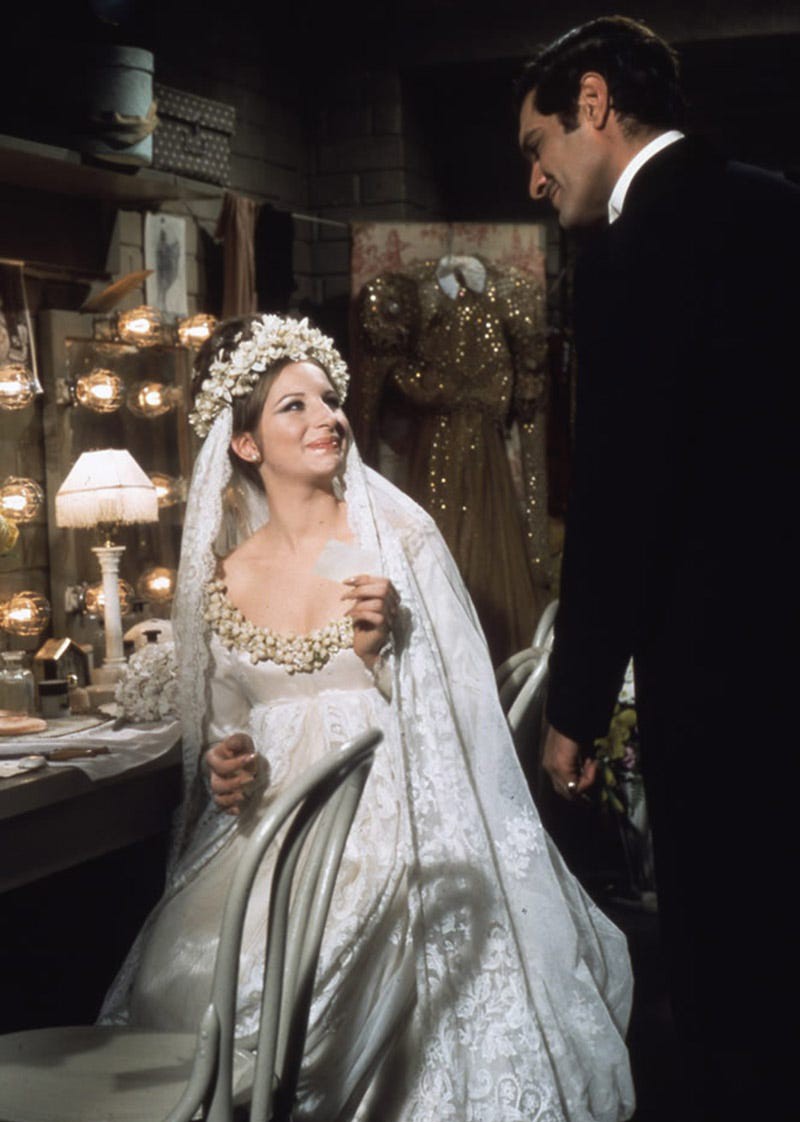 Barbra Streisand’s wedding moment in Funny Girl wasn’t about subtlety — it was about spectacle. And that’s exactly what her gown delivered. Designed in the late-1960s spirit of more is more, the dress was a glorious mix of embroidered lace, full sleeves, and a dramatic empire waist, finished with a halo-like headpiece and veil that cascaded down the stairs like stage lighting in fabric form.