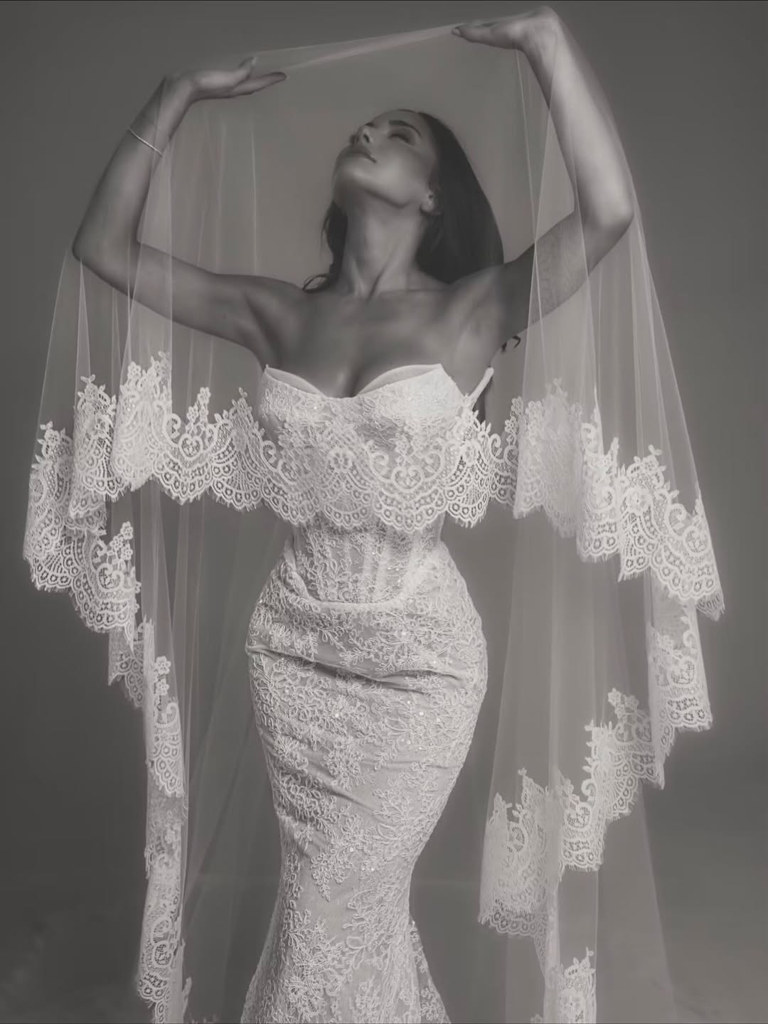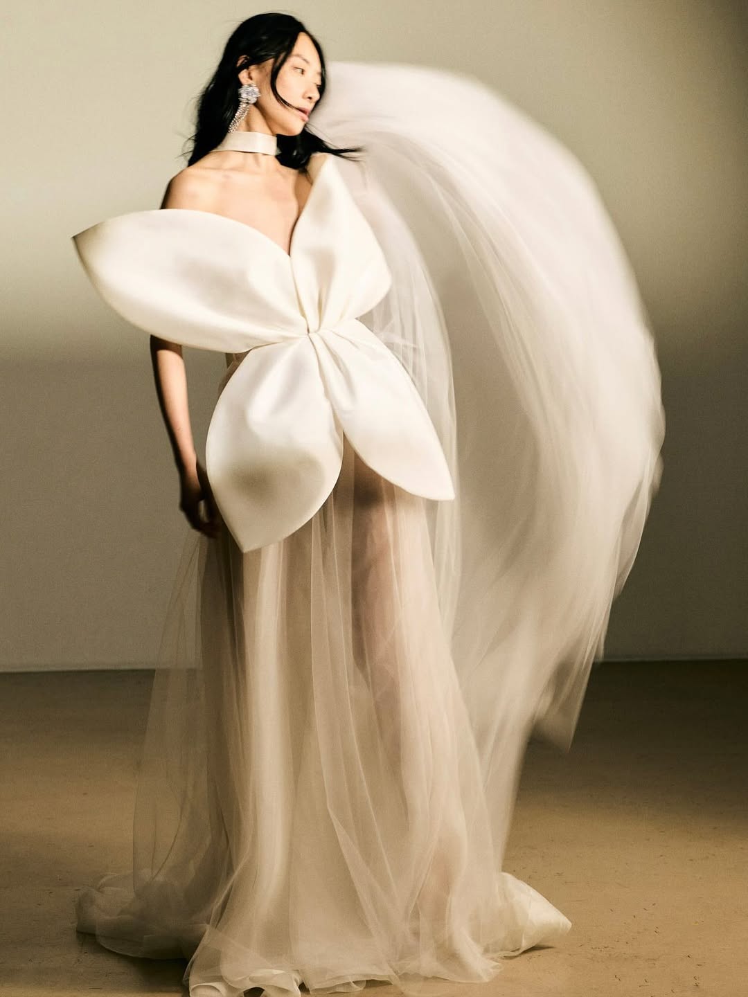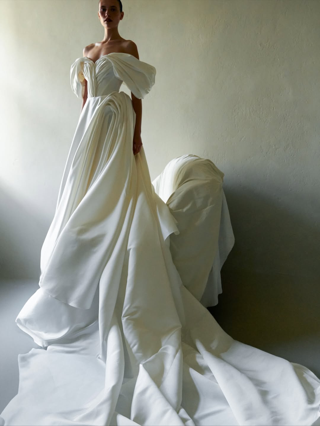 Layering in bridal fashion has moved beyond soft, romantic. Editorial shoots now often use several layers of transparent fabrics, each one catching the light in its own way and creating depth by overlapping. Designers also take volume to new heights, with sleeves that fill the whole frame, trains that stretch across the scene, and veils that create entire environments instead of just being accessories.