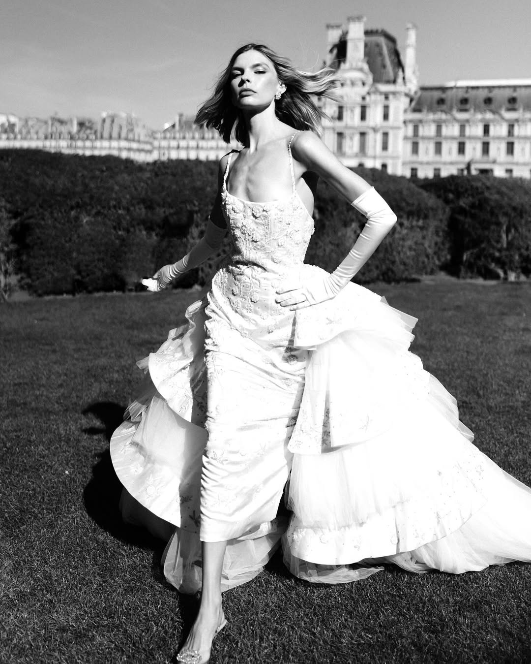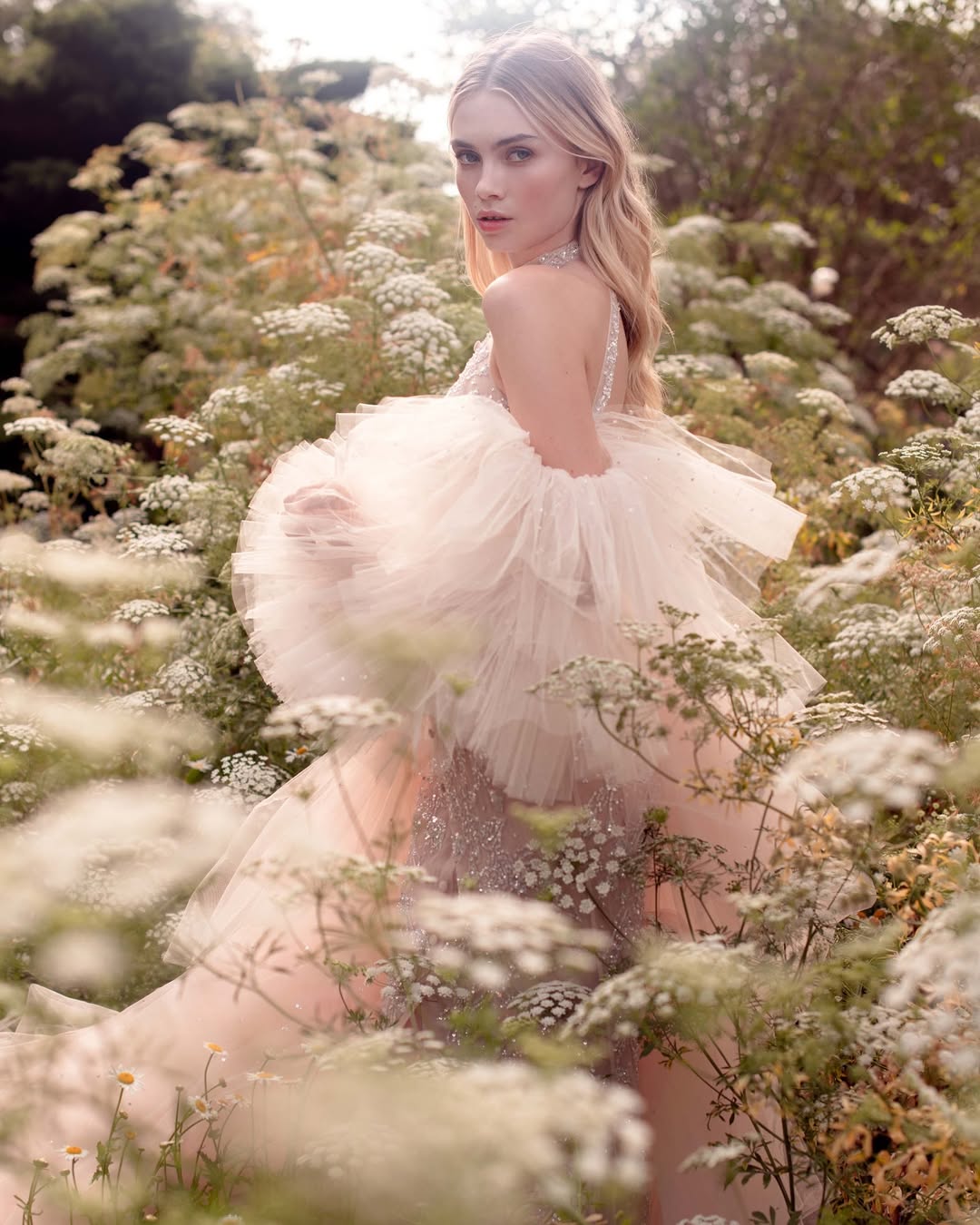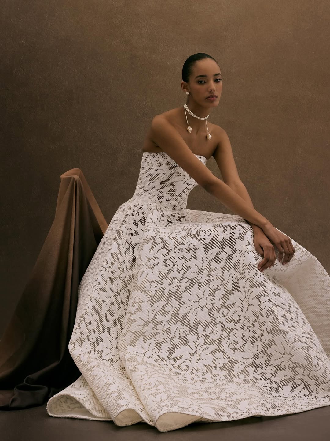 Layering in bridal fashion has moved beyond soft, romantic. Editorial shoots now often use several layers of transparent fabrics, each one catching the light in its own way and creating depth by overlapping. Designers also take volume to new heights, with sleeves that fill the whole frame, trains that stretch across the scene, and veils that create entire environments instead of just being accessories.