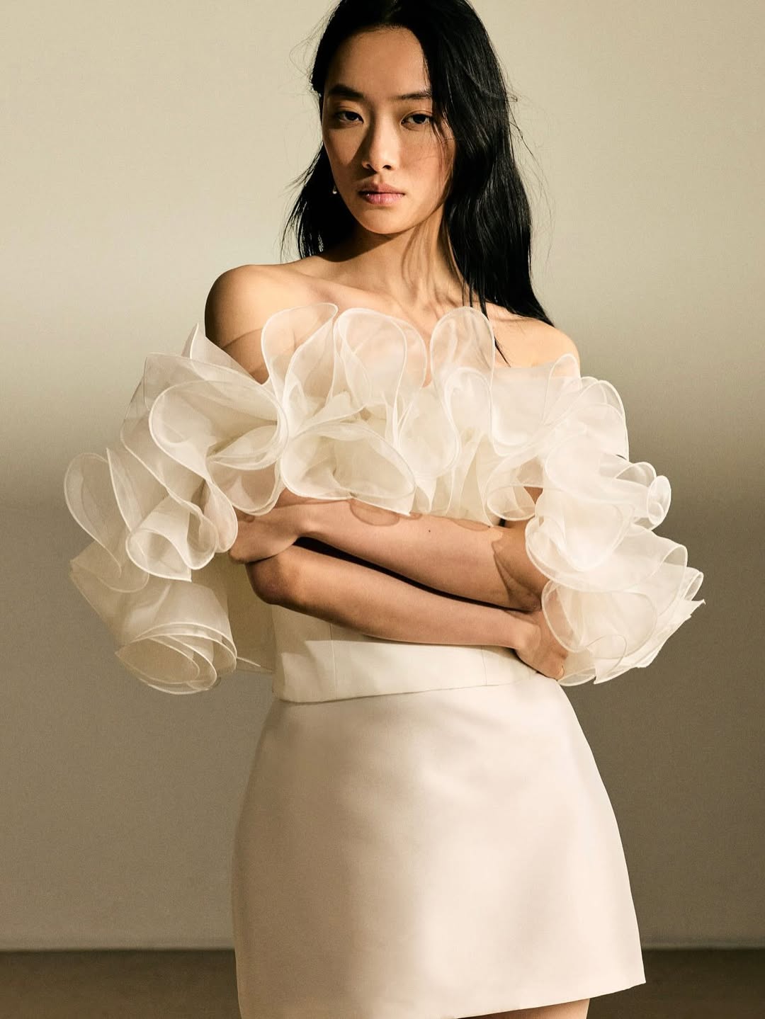 Sculptural bridal silhouettes are popular in high-fashion editorials because they appear as shapes rather than just decorations in photos. Picture structured bodices making bold horizontal lines, or skirts so voluminous they look like architectural pieces. These dresses do not simply make the body look pretty; they turn it into something geometric, unusual, and striking. The magazine’s photos use a minimalist style, but it’s not soft or romantic. Instead, the clean lines stand out, and the simple color schemes make you notice texture and shadow. The sharp silhouettes almost look severe. Draping turns sculptural as it gathers and shapes the image. A sleeve is more than fabric on an arm; it becomes a cascade that leads your eye down, forming a vertical line in the photo. Editorial high-fashion bridal photography finds drama in simplicity. A single fold of fabric can be as striking as a bouquet. The empty space around the bride’s outline matters just as much as the shape itself. Every detail supports the overall form, the lines, and the balance between solid and empty space.