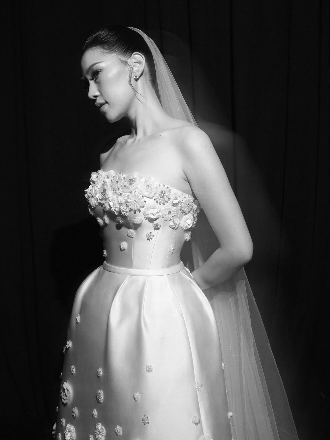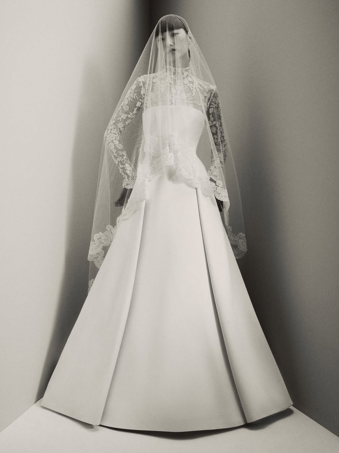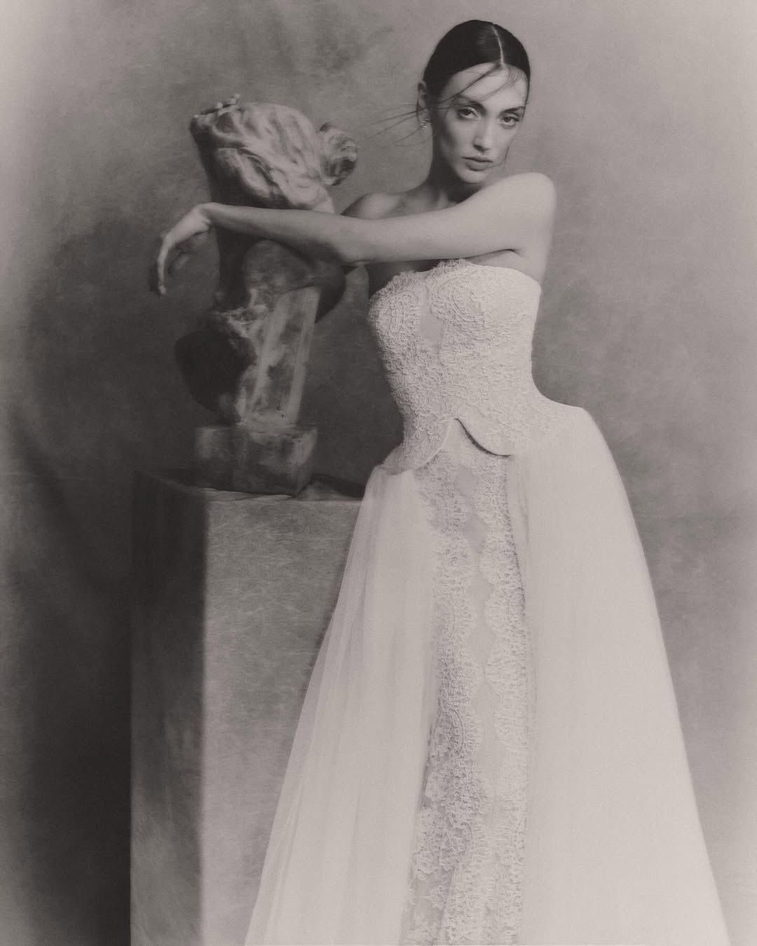 Bridal fashion editorials now often look like gallery presentations, with photos taken against plain white backgrounds or in stark concrete spaces where the building’s shapes compete with the dress. Black-and-white photos are used not for nostalgia but to highlight form, texture, and tone by removing color. These editorials feel more like fashion week coverage than a wedding, and that’s exactly what they aim for.