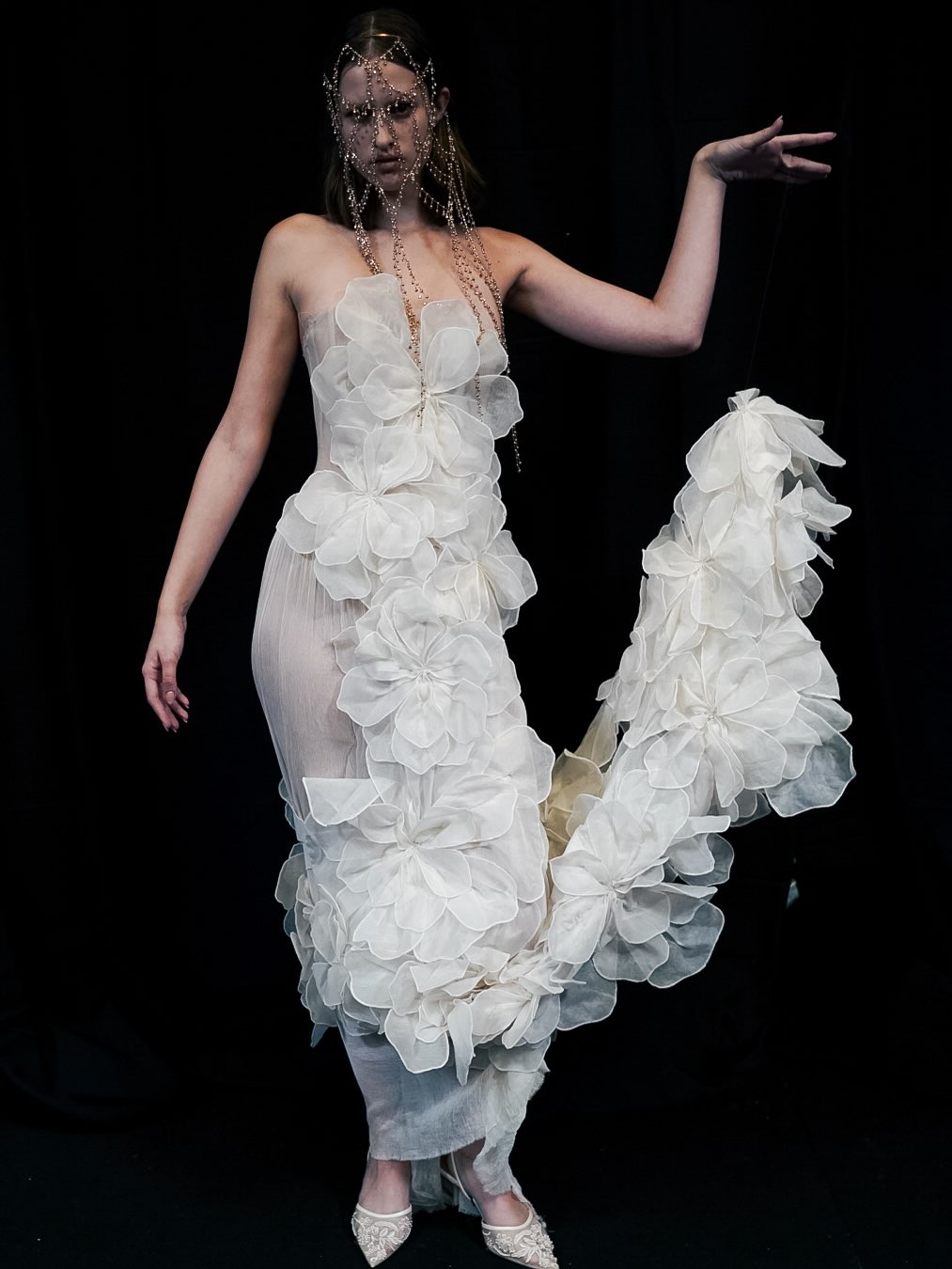 Dresses with sculptural shapes call for creative design, even without a couture budget. In this bridal editorial, the dress choices focus on bold, architectural details instead of traditional beauty. You’ll see asymmetry, unusual proportions, and construction details that stand out in photos. Some bodices are tightly corseted, creating dramatic hourglass shapes that almost look exaggerated. Skirts may be flat in front and full in back, making side views look like fashion sketches brought to life. Here, fabric is treated like a sculptor’s material: Mikado silk holds sharp folds, organza is layered until it turns opaque, and crepe hugs the body to show off its shape. The construction is meant to be seen and appreciated. Boning adds structure, seams are placed for visual effect, and draping is left unfinished on purpose, because the process is just as interesting as the final look.