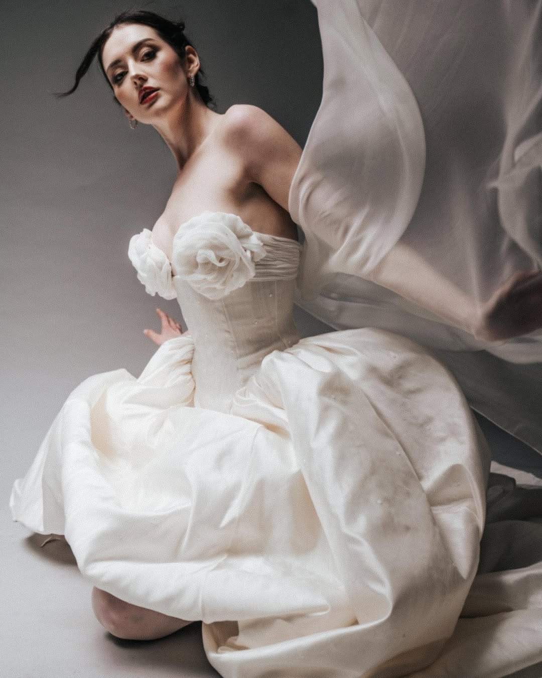 Editorial bridal portraits break away from traditional wedding poses. You won’t see the usual hand on hip or a soft smile aimed at an unseen groom. Instead, each pose is like a sculptural challenge. How can the body shape interesting spaces? What happens if arms stretch in ways that feel a bit awkward, adding tension to the photo? This style of bridal photography focuses on how the body and fabric work together. A hand might gather, crush, or pull the tulle tight to make bold lines in the photo. Sometimes, the bride faces away because the back of her dress is more striking than her expression. Movement is caught at unusual times, like during a turn when things blur, or in a moment of stillness that looks almost like a sculpture. These photos don’t fit into typical wedding timelines or clichés. It’s hard to say if they were taken before the ceremony, after the reception, or at any specific moment. The feeling isn’t about happiness or excitement. Instead, there’s intensity, a sense of strangeness, and a serious beauty that focuses on form rather than celebration.