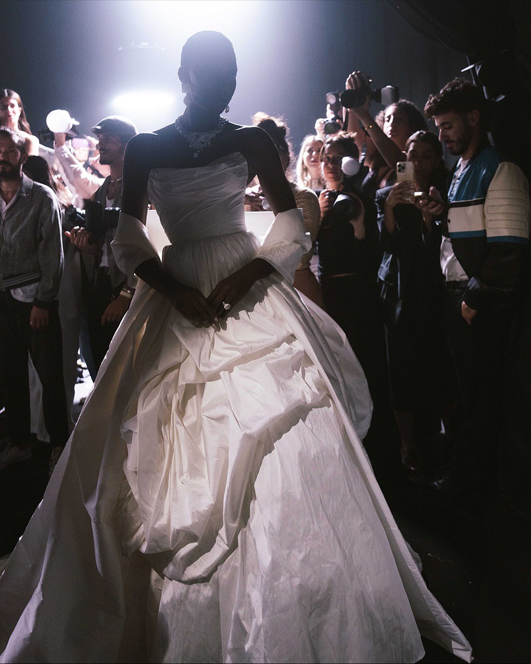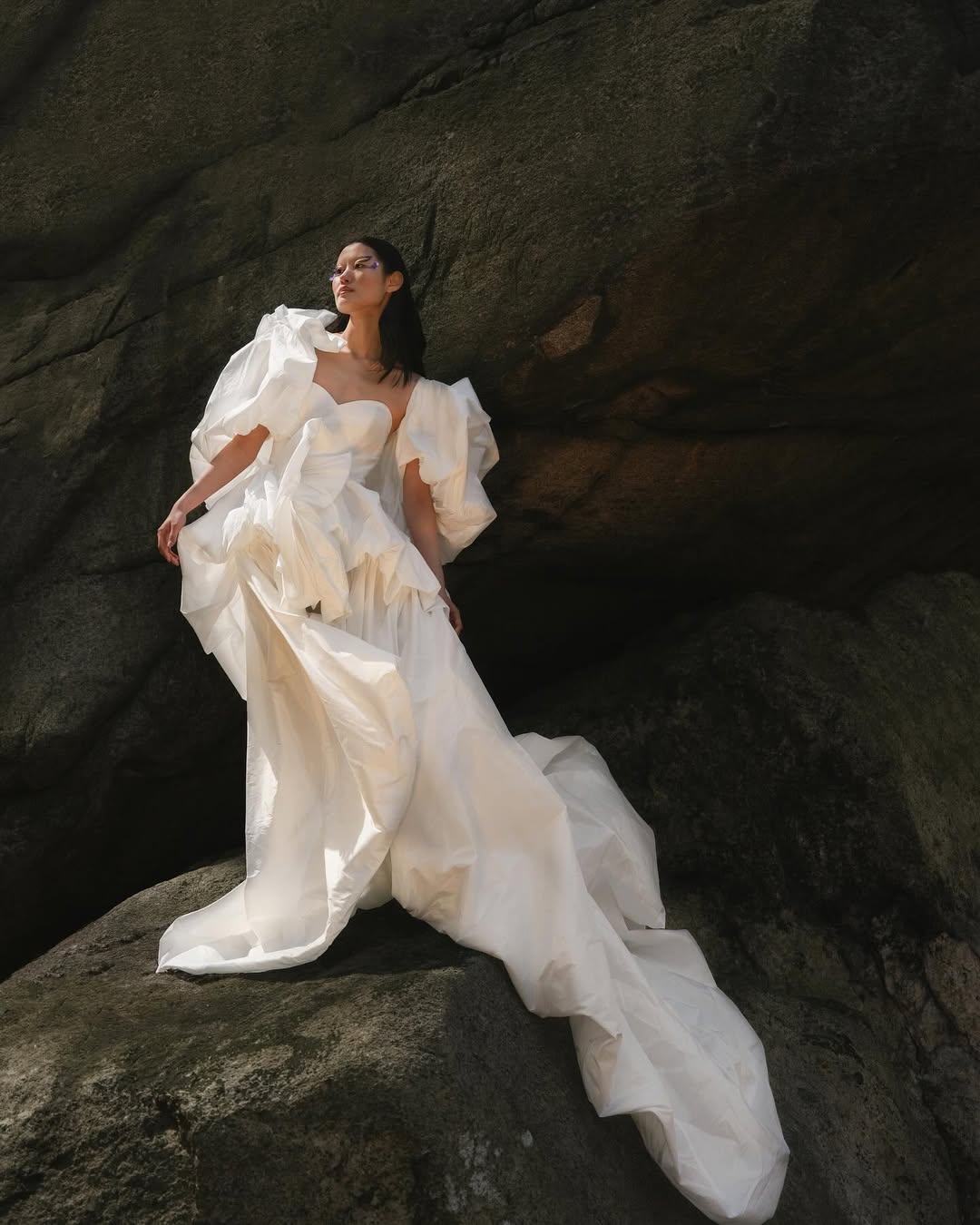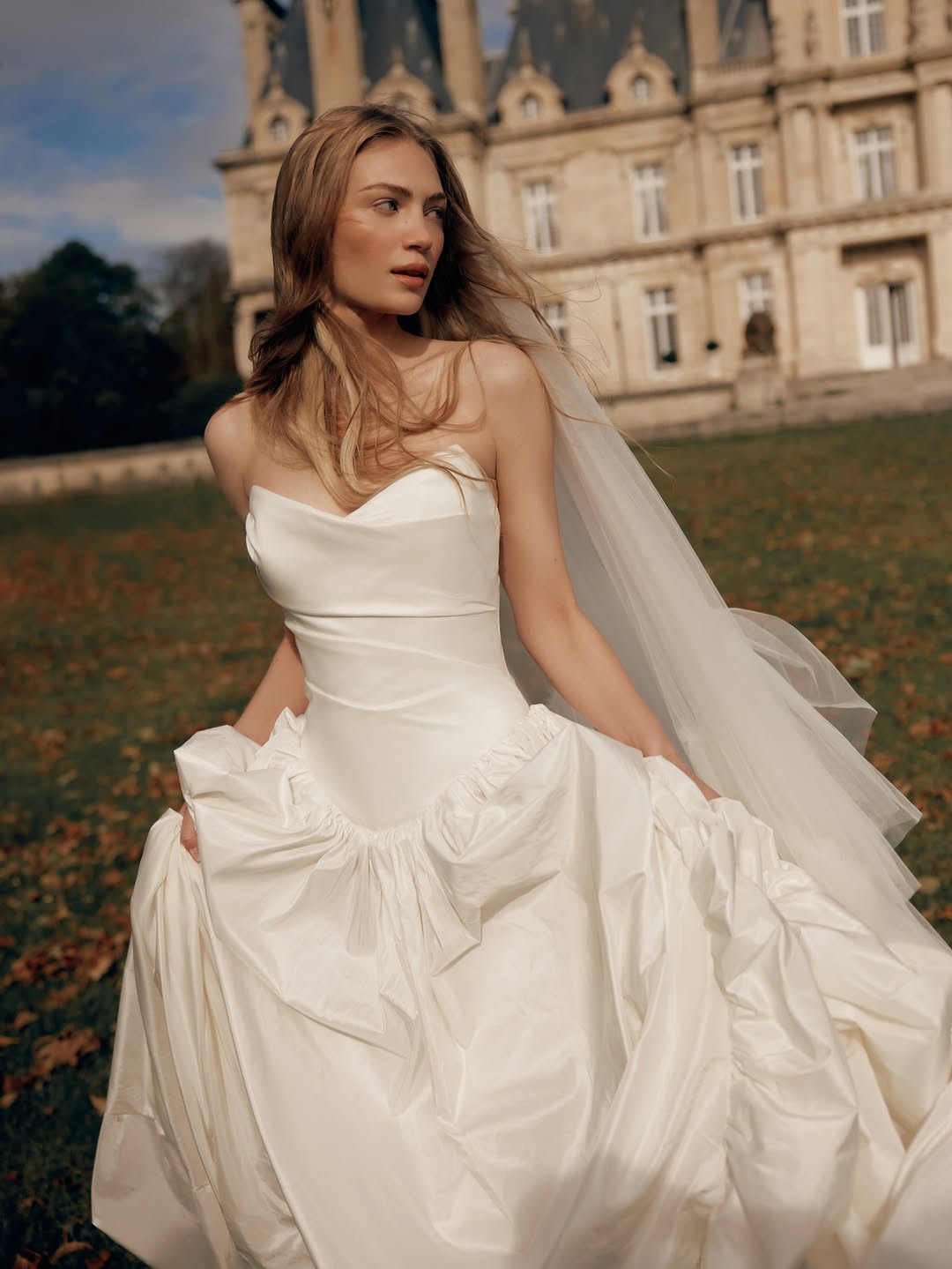 These gowns are ahead of the trend because they do not stick to the usual styles. A top might have tight folds that suddenly spread out into a big, gathered shape at the hip. A skirt might look smooth from the front, but from the side, you can see layers of shaped folds. This puffy bridal dress style is great for brides with an artistic sensibility and who see fashion as art. It is perfect for those who want their gown to showcase both skill and beauty. The way these gowns move is striking – the shaped folds add weight and movement, making every turn dramatic and every step look meaningful and eye-catching.
