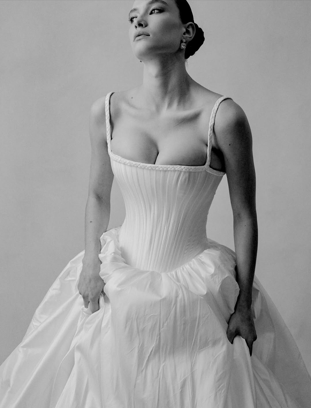 | Corset + Airy Drapery | Bust support, hourglass, pear | Traditional or elegant indoor weddings | Front portraits, soft light |
