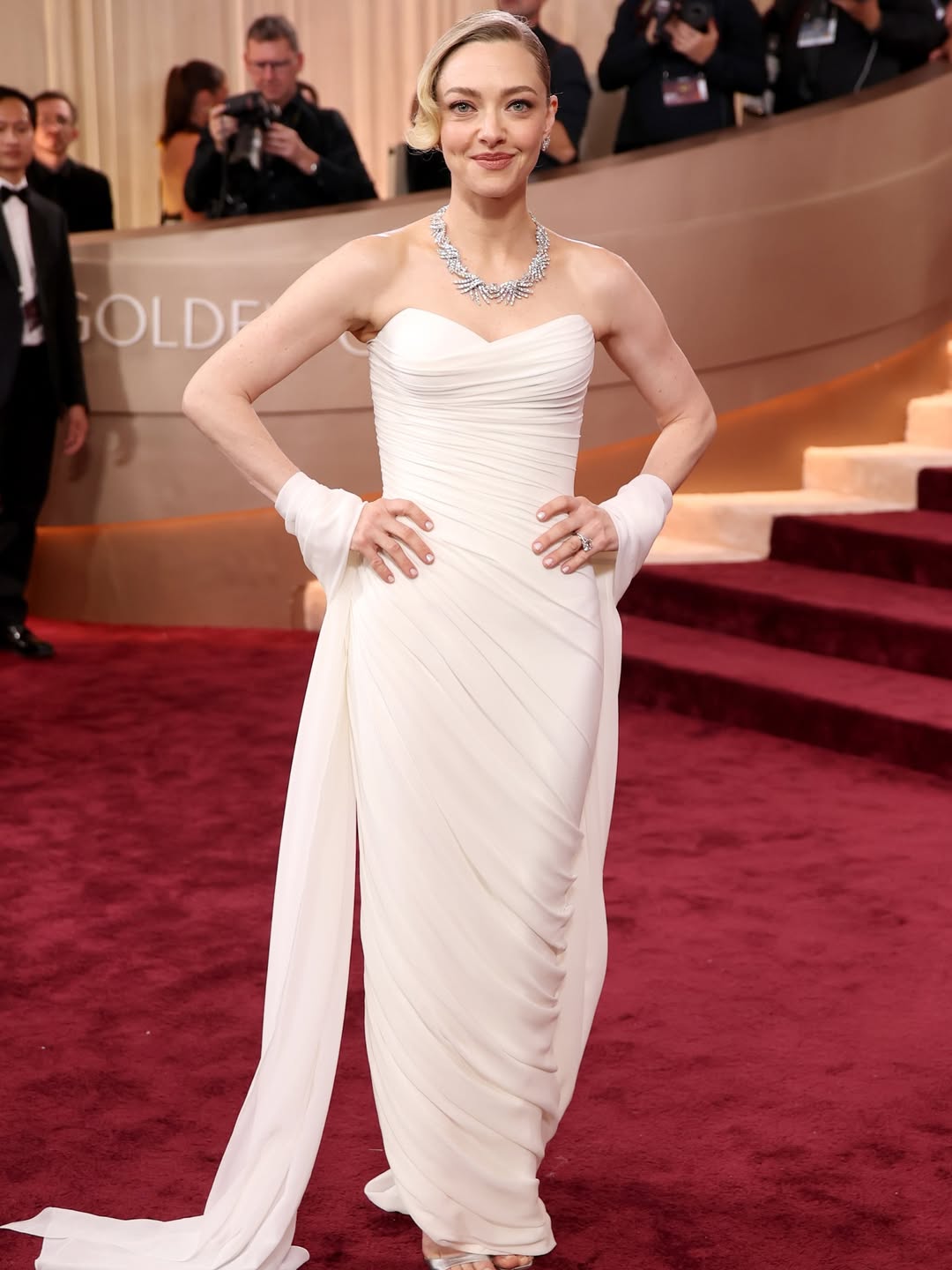 Amanda Seyfried went full bridal in a custom white strapless sweetheart gown with diagonal drapery and a dramatic train that turned into a stole because apparently one look wasn't enough.