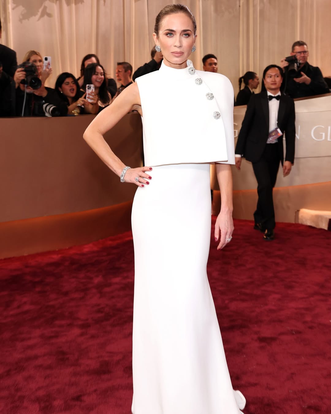 Emily Blunt's white asymmetric Louis Vuitton with one sleeve was sharp, architectural, and exactly the kind of dress that photographs perfectly from every angle.