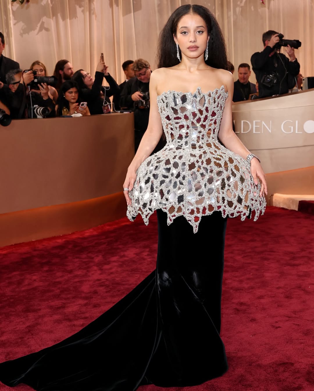 Chase Infiniti wore a custom mirrored, corseted Louis Vuitton by Nicolas Ghesquière that literally reflected every camera flash back—subtlety was not invited.