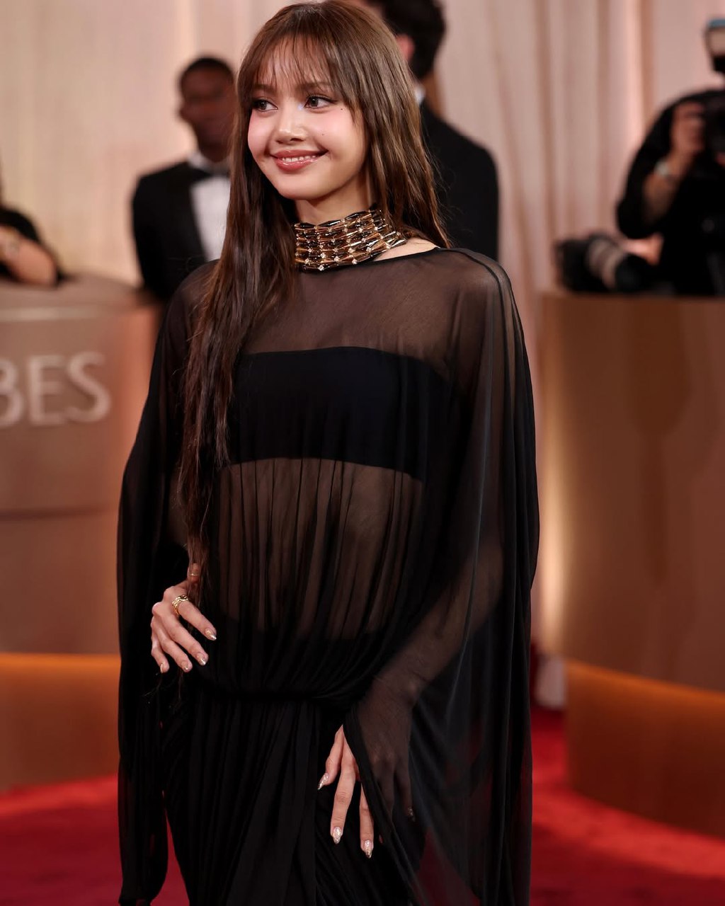 Lisa stunned in black Jacquemus with a sheer top and black tube top—modern, sexy, and perfectly constructed.