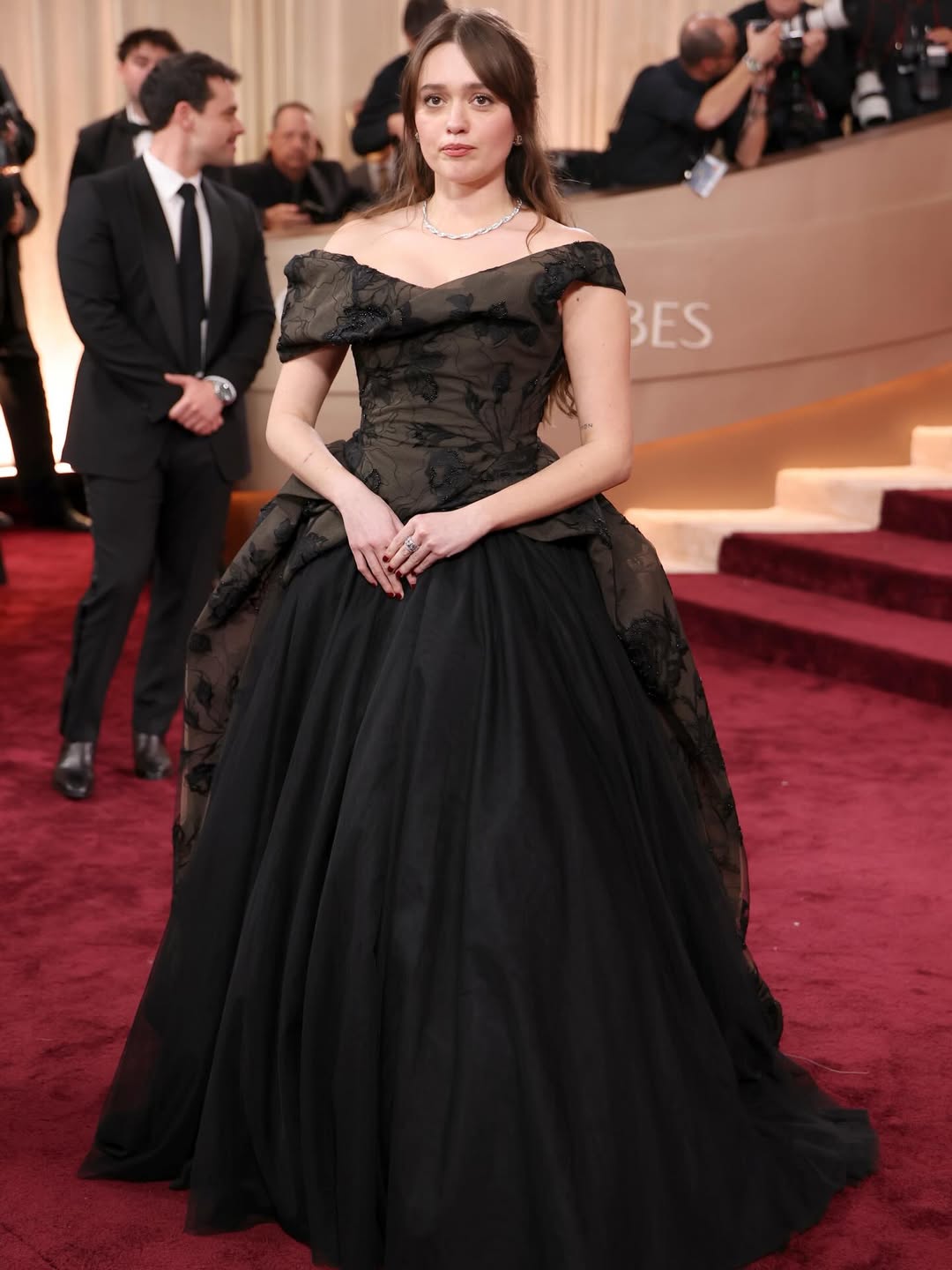Aimee Lou Wood showed up in a black brocade ball gown by Vivienne Westwood with the kind of volume that takes up space unapologetically.