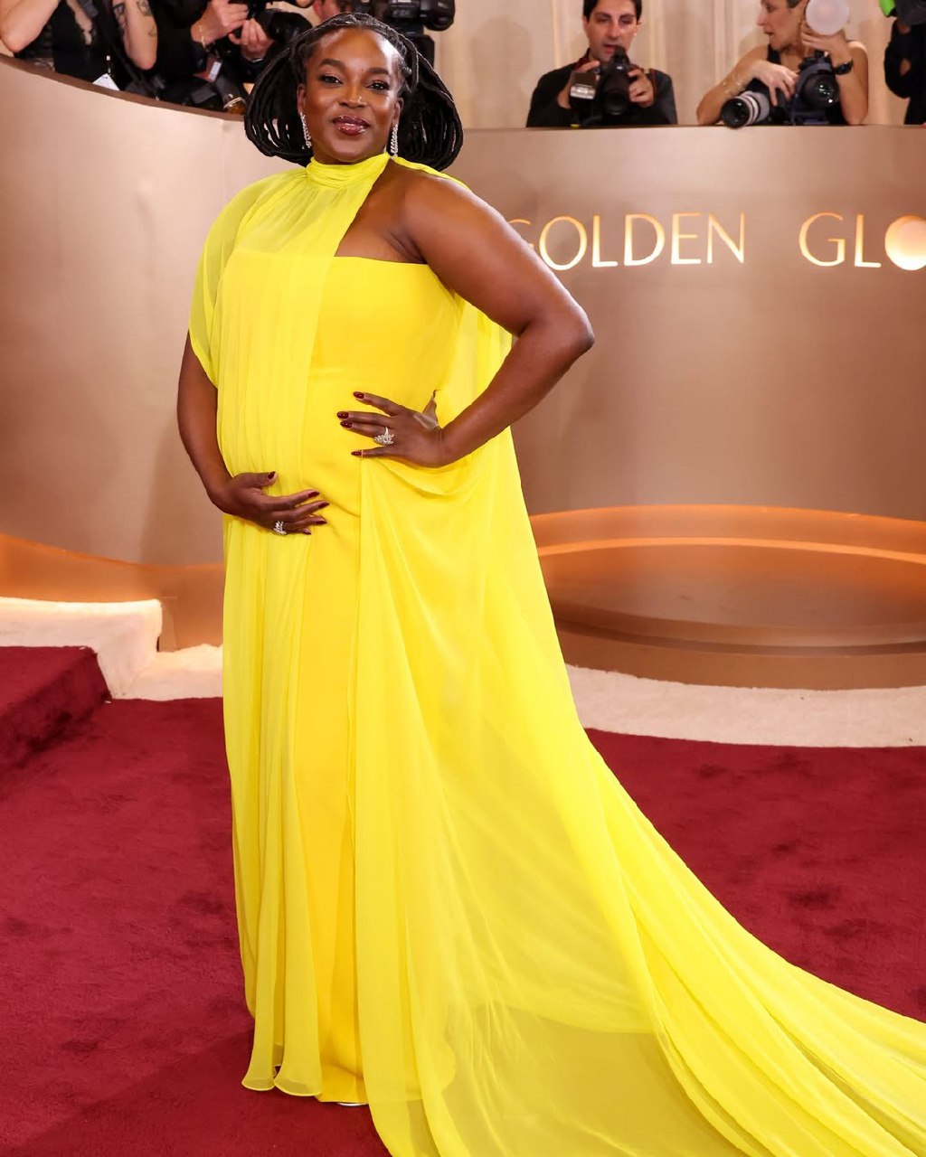 Wunmi Mosaku wore a bold yellow Matthew Reisman gown that showed off her bump and proved maternity style doesn't have to be boring.