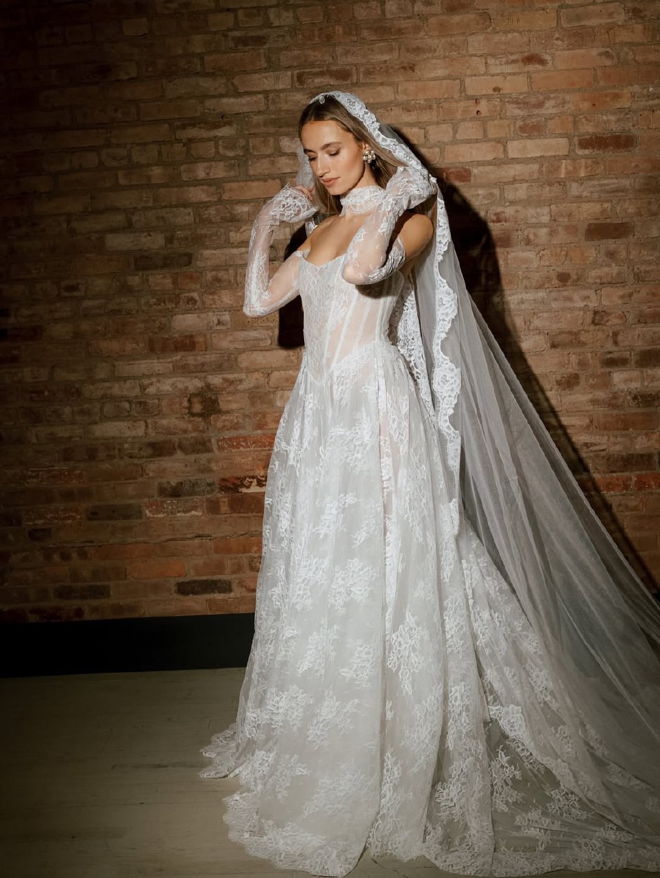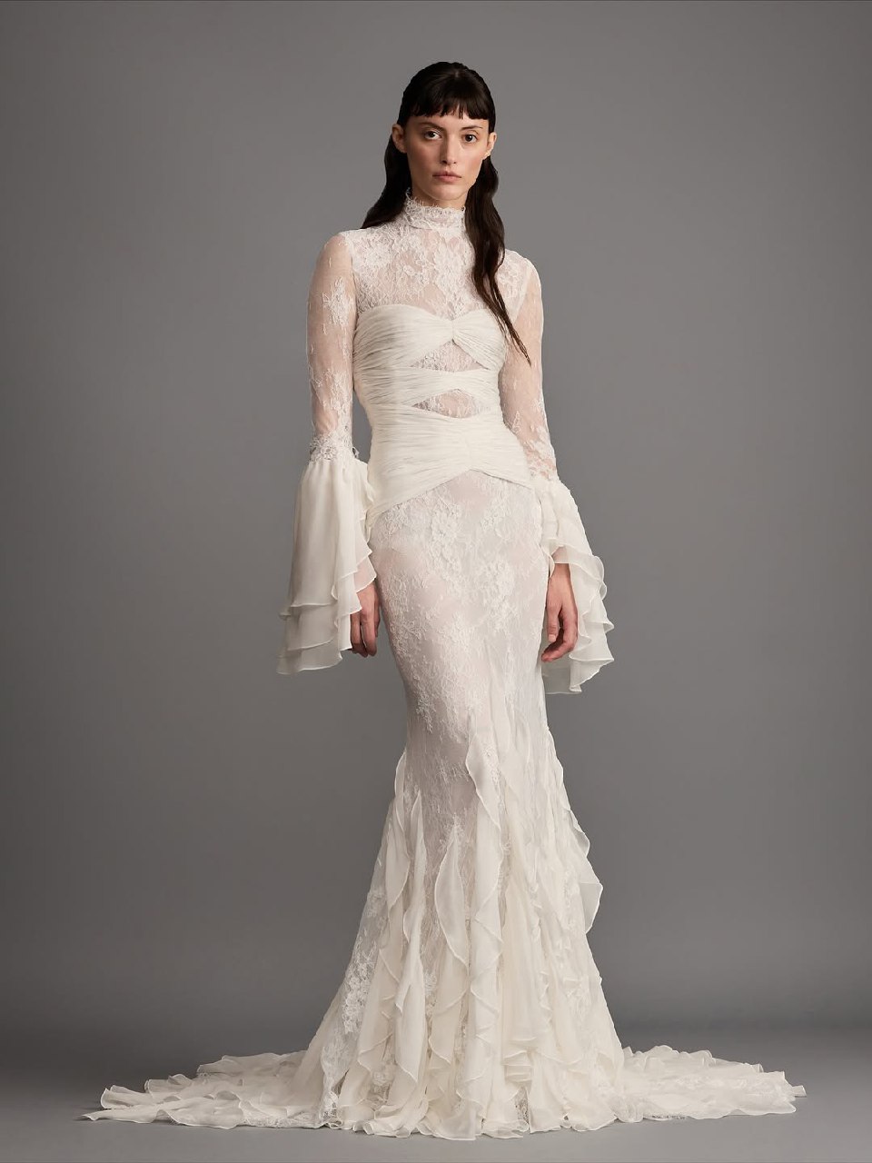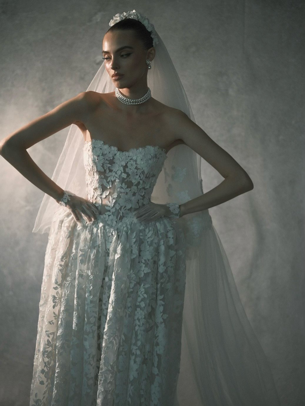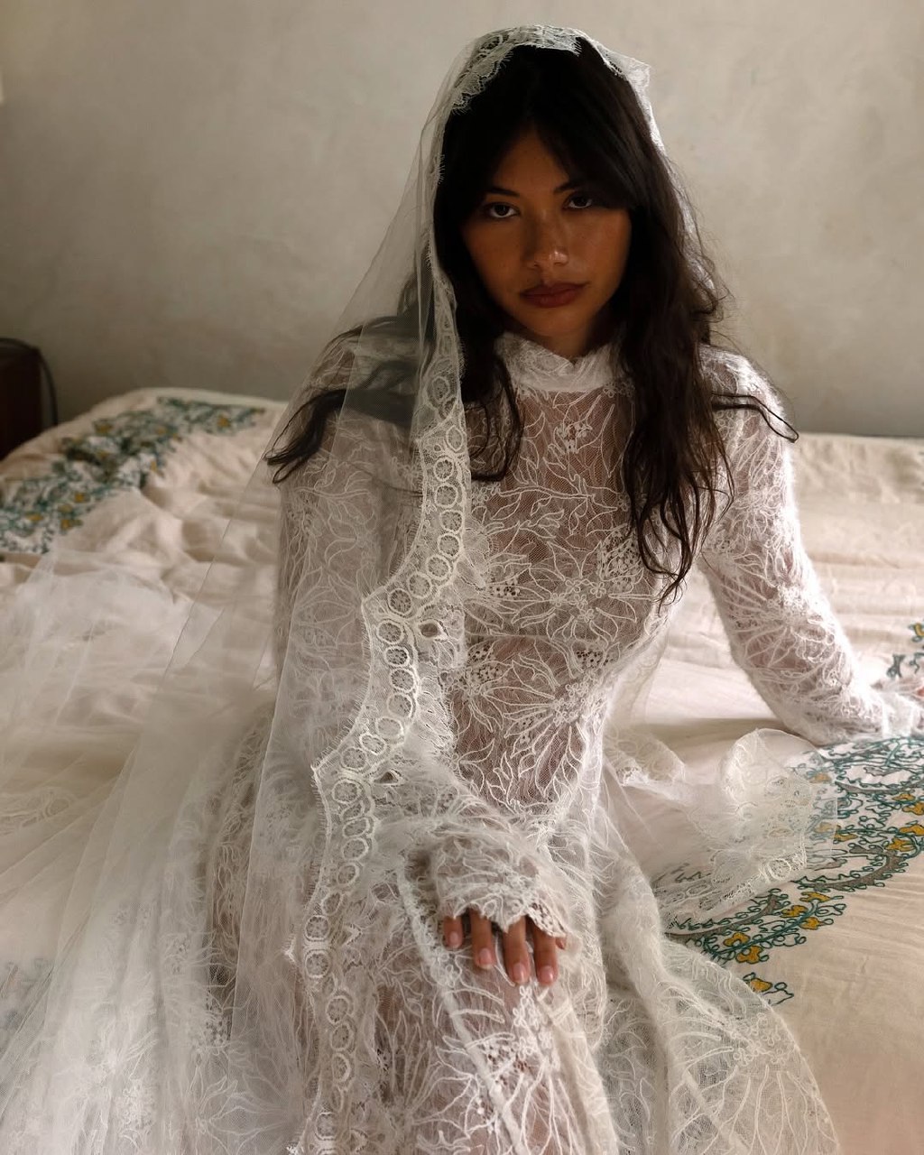 We're seeing a whole new take on transparency with sheer sleeves, illusion panels, and guipure appliqués that sit on the skin like sophisticated tattoos. Others opt for the opposite look, covering gowns in guipure wedding lace fabric for a rich, artistic feel that doesn't feel over-the-top. Contrast remains a significant element of the design, with thick guipure paired with light tulle or organza, stiff bodices balanced by light skirts, and cutouts surrounded by guipure borders that add an edge while maintaining a classy look. Negative space makes intricate patterns look clearer and more modern.