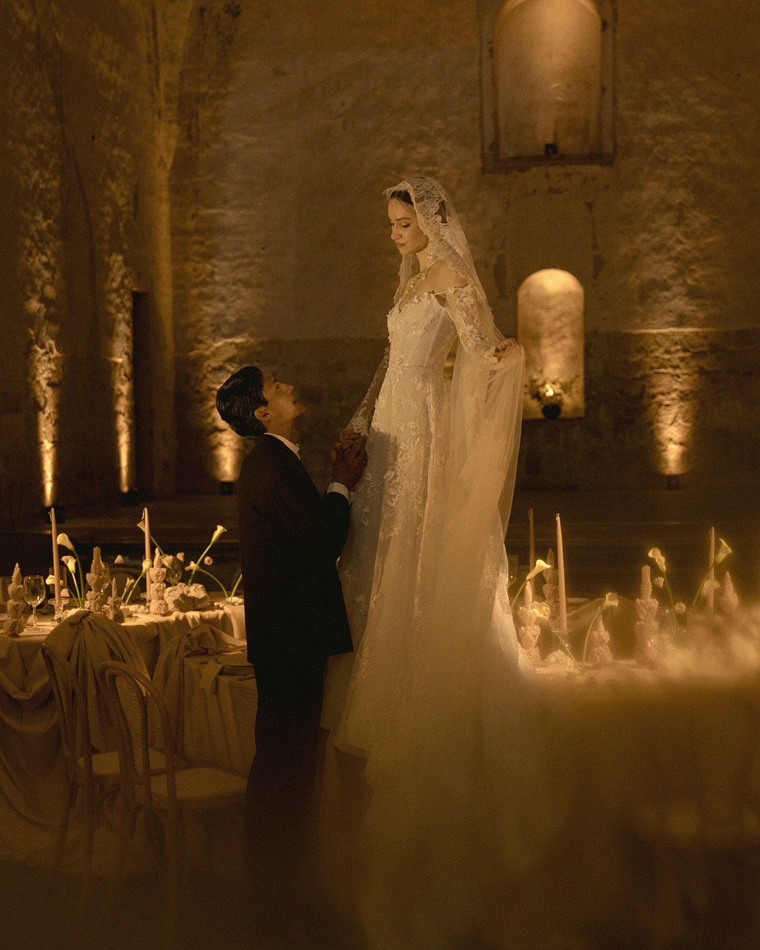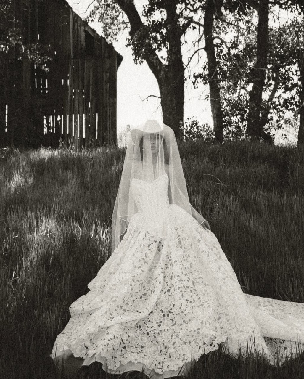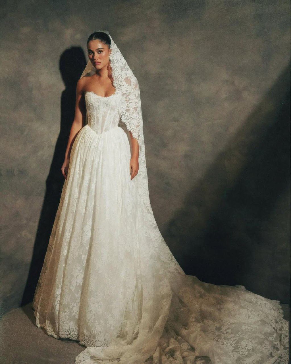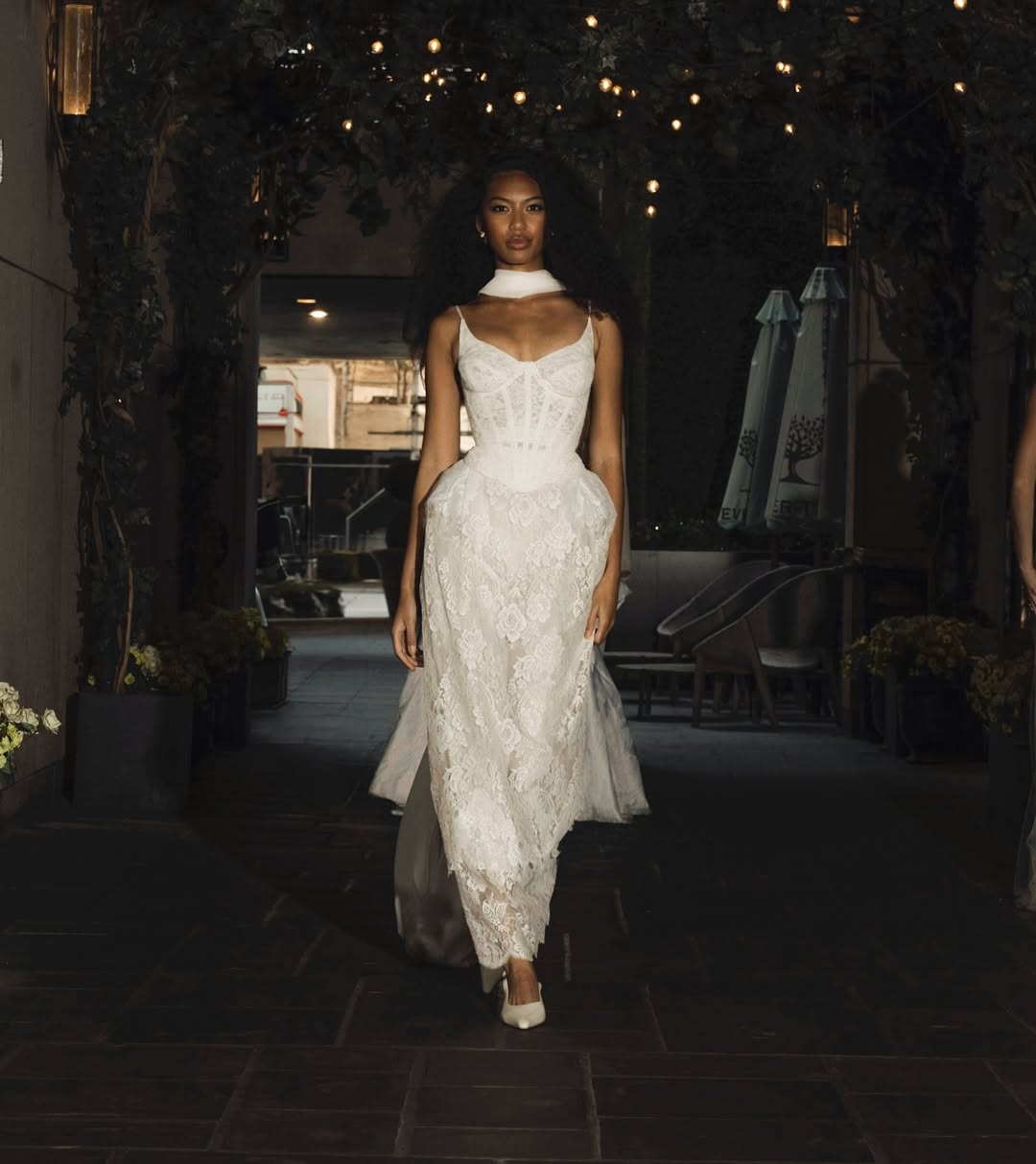We're seeing a whole new take on transparency with sheer sleeves, illusion panels, and guipure appliqués that sit on the skin like sophisticated tattoos. Others opt for the opposite look, covering gowns in guipure wedding lace fabric for a rich, artistic feel that doesn't feel over-the-top. Contrast remains a significant element of the design, with thick guipure paired with light tulle or organza, stiff bodices balanced by light skirts, and cutouts surrounded by guipure borders that add an edge while maintaining a classy look. Negative space makes intricate patterns look clearer and more modern.