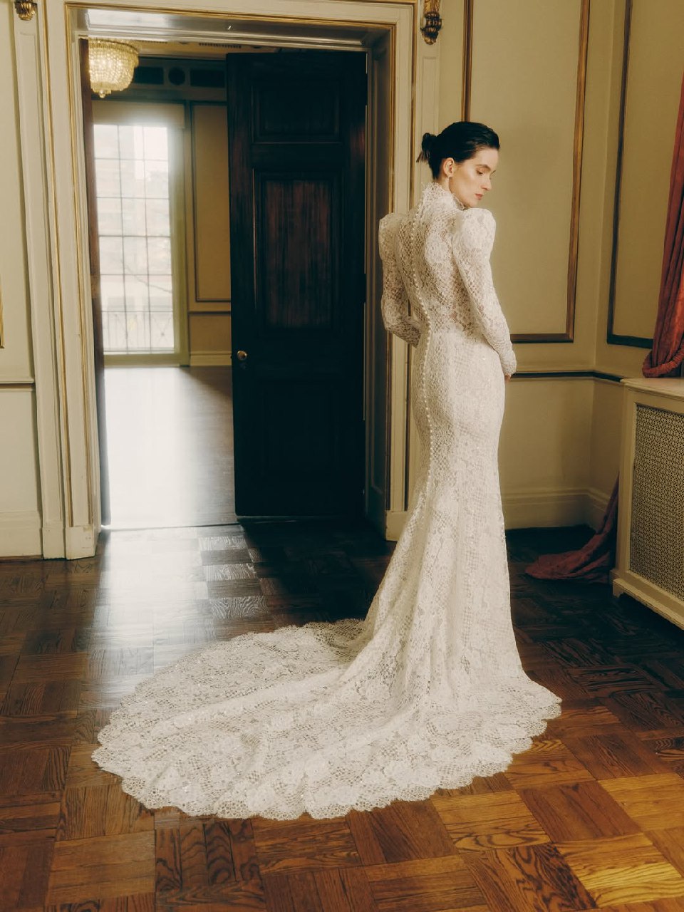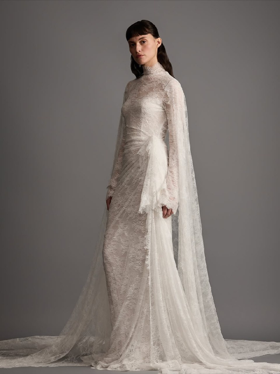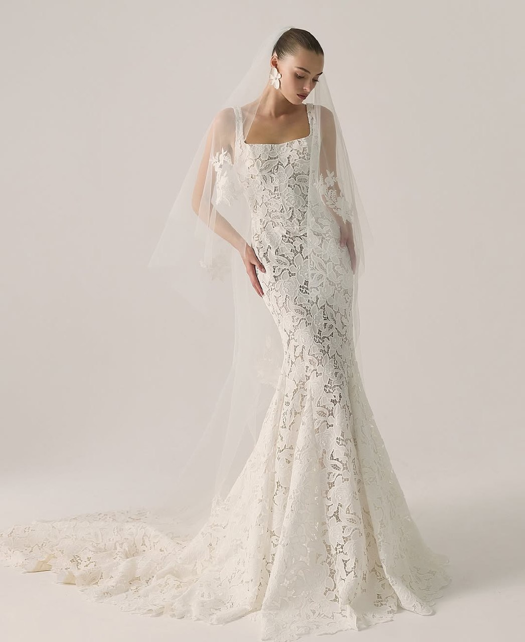The Guipure wedding dress 2026 is defined by bold proportions – think sharper shoulders, sculptural trains, exaggerated sleeves, and mixed densities of guipure layered within one gown. Subtle metallic threads or delicate beading enhance the texture without competing with it.