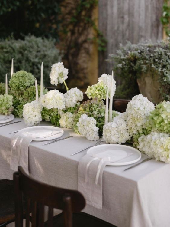 Hydrangea centerpieces wedding concepts are among the most requested by brides seeking show-stopping reception décor. Because of their size and fullness, hydrangeas require fewer stems to create a lavish effect, making them both cost-effective and impactful. A single hydrangea head can fill a vase, while clusters of mixed hydrangeas and roses produce dramatic tablescapes that guests will remember.Low hydrangea centerpieces are perfect for intimate dinners where conversation is key. Elevated arrangements, on the other hand, create grand visual statements in ballrooms and outdoor tents. Designers often mix hydrangeas with trailing greenery, crystals, or candles to add depth and luxury. By incorporating them into long banquet tables or circular tablescapes, hydrangea wedding flowers achieve an unforgettable reception atmosphere.For couples who want a unique touch, hydrangeas can be placed in vintage urns, glass cylinders, or even wooden boxes for rustic charm. The choice of vessel changes the entire mood, proving how versatile hydrangea wedding decor can be.