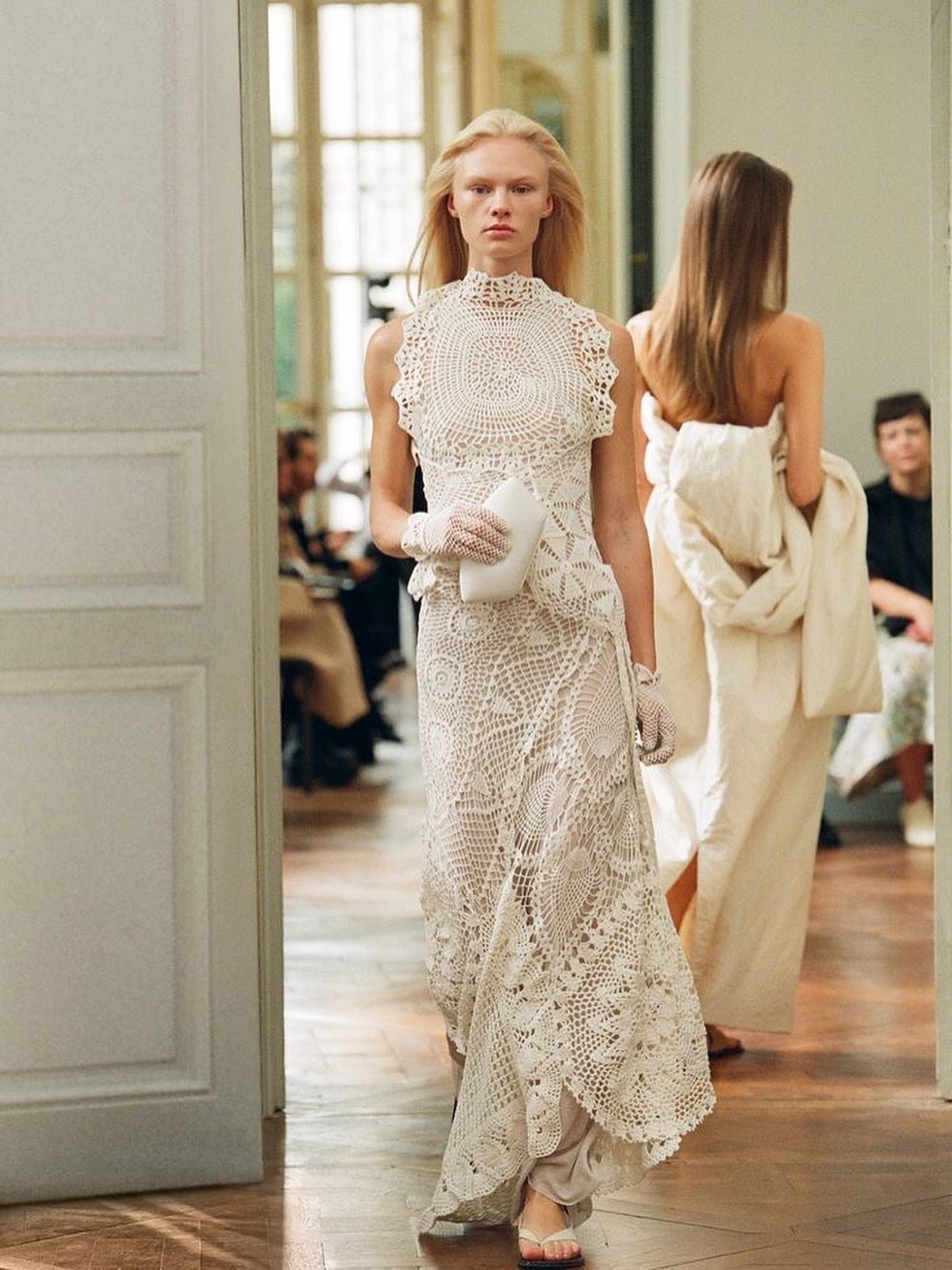 - Long dresses with open-stitch inserts – panels of lacework that reveal skin in strategic, elegant ways