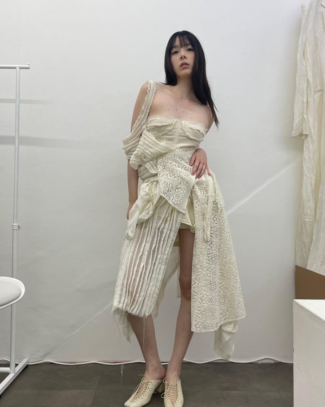 - Mixed-material constructions – knitted tops paired with silk skirts for contrast and movement