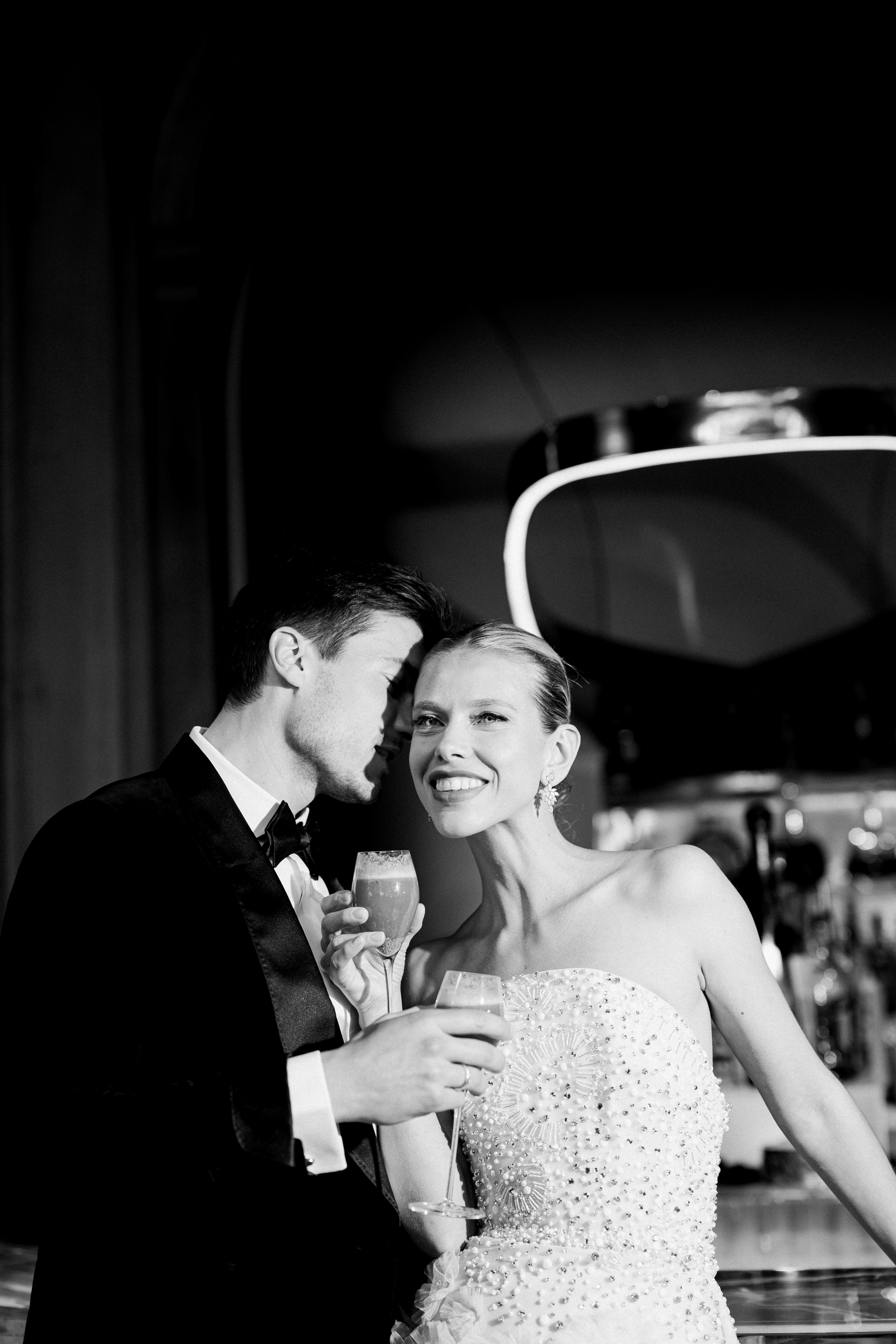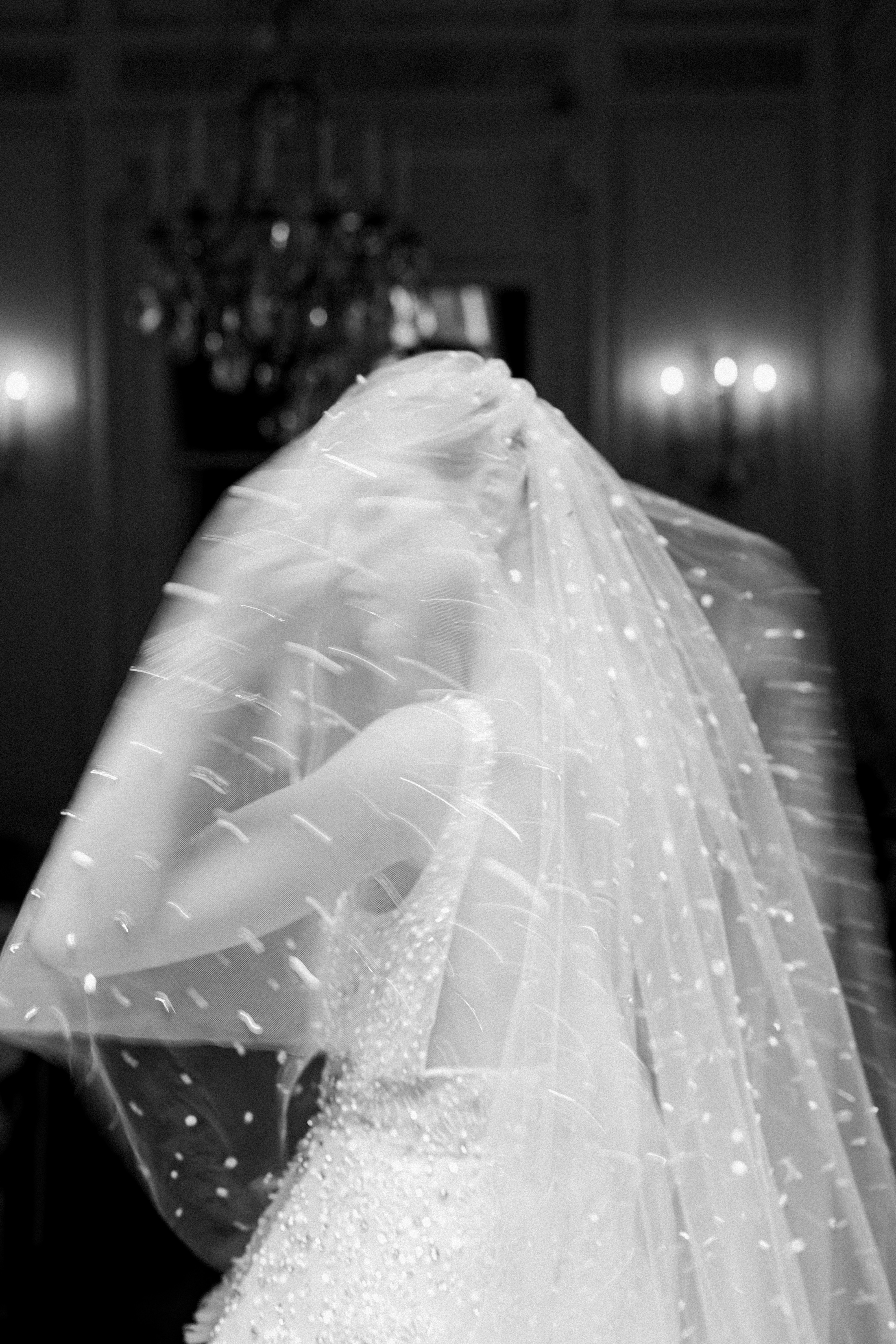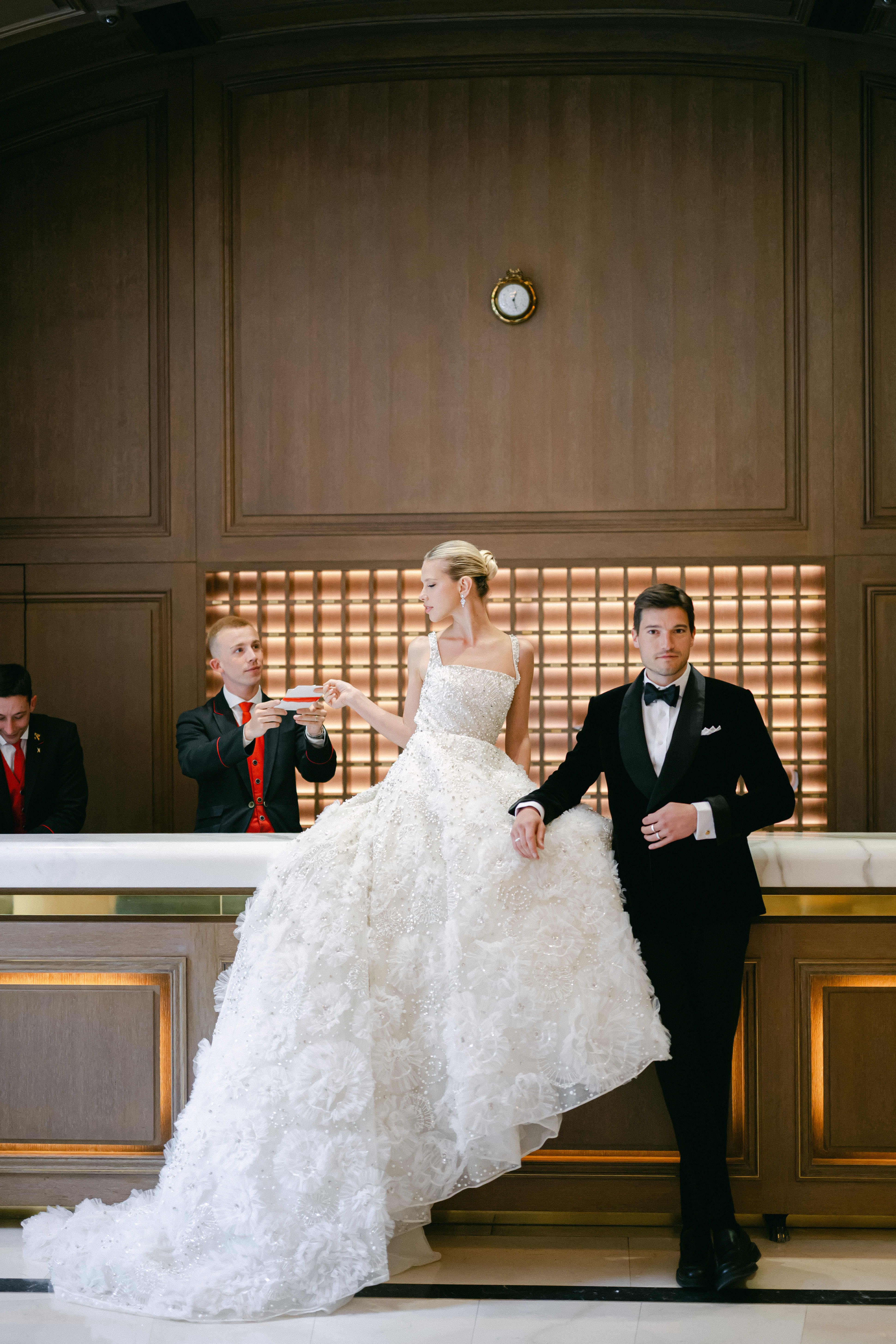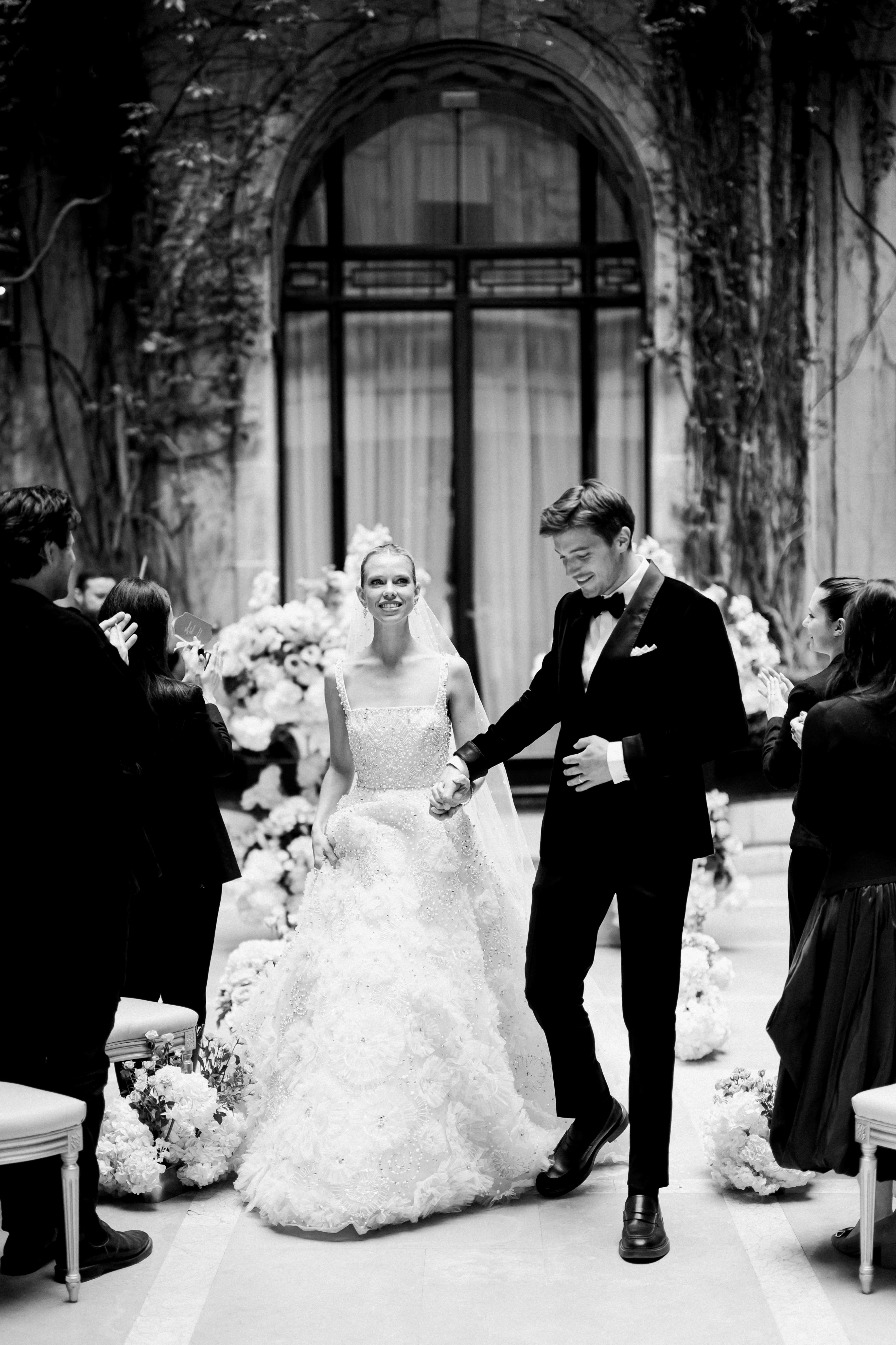 No detail was left untouched when it came to fashion. In true Elie Saab style, the bride’s wardrobe was envisioned as a trilogy of couture moments: each gown more captivating than the last, echoing the emotion of each chapter of the celebration. From delicate lace to dramatic trains, the looks merged editorial drama with timeless grace, embodying the spirit of modern bridal elegance — and ensuring every step felt like a runway moment set against the grandeur of Paris.