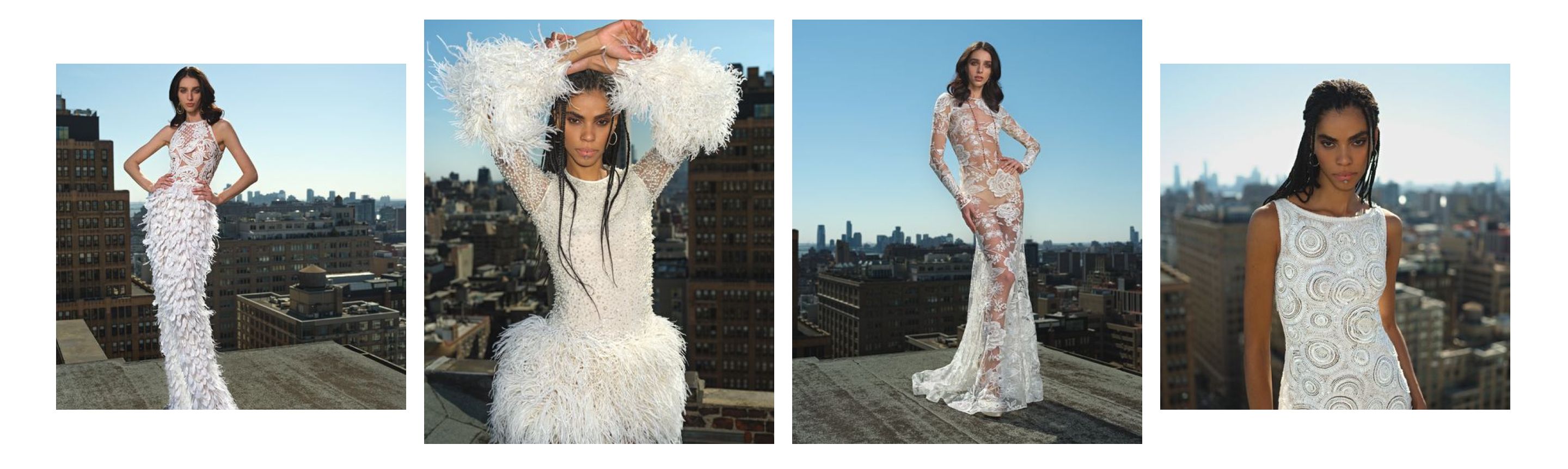 Bold and unique necklines are a highlight of this collection, with off-the-shoulder, plunging, and asymmetrical designs making a statement. These necklines add a modern edge to classic silhouettes, offering brides a fresh and contemporary look. - Sheer Fabrics: