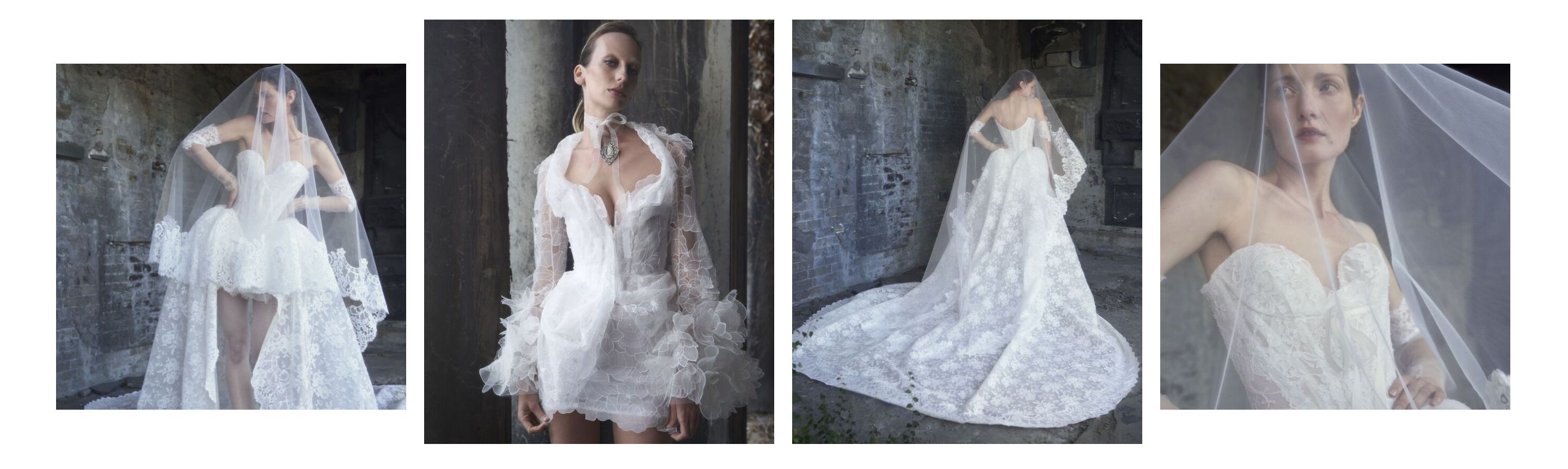 - Romantic Details – Floral appliqués, lace, and embroidery add softness and elegance to her bridal gowns. These touches emphasize the romantic side of the brand, without conflicting with its avant-garde spirit.