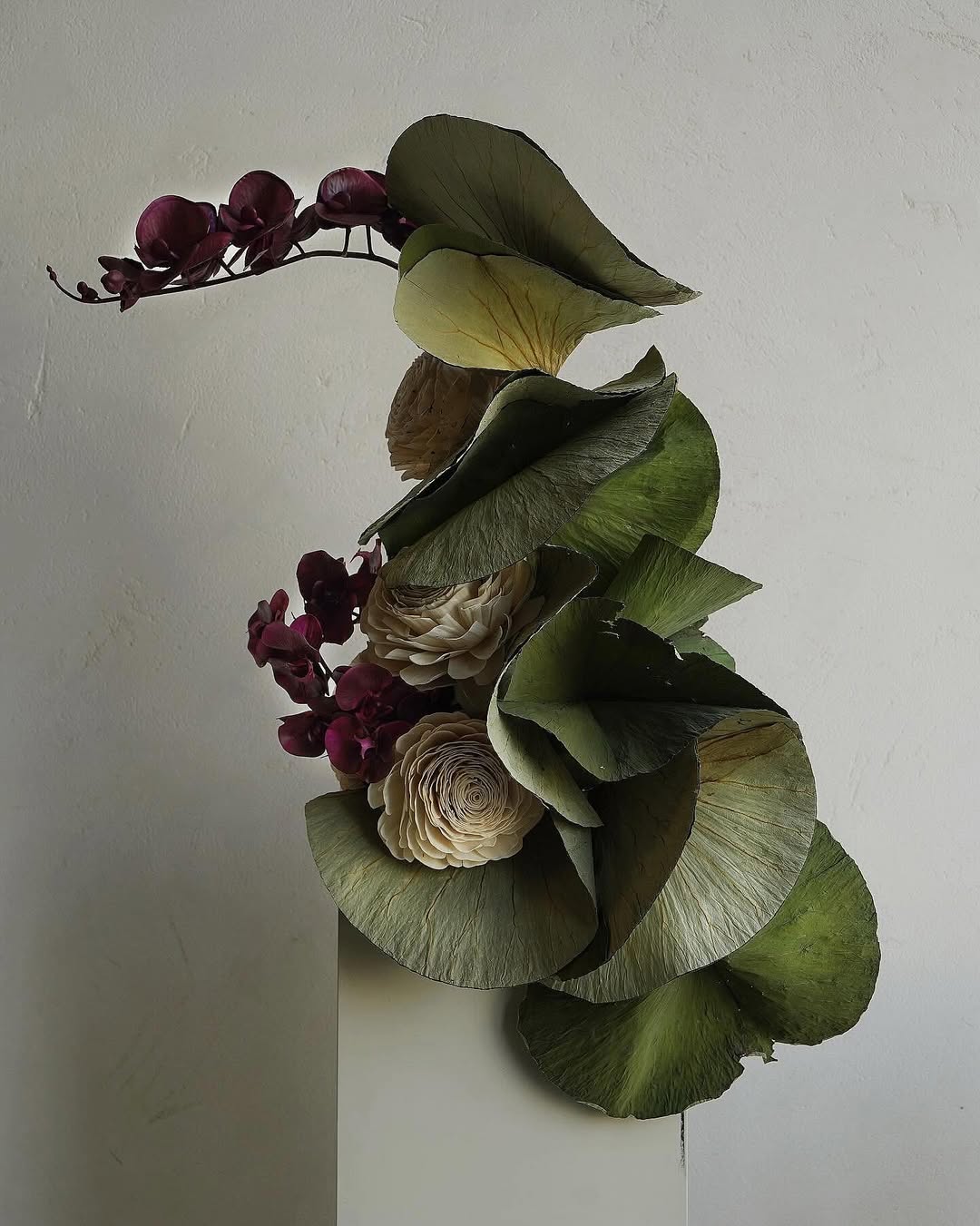 Organic floral arrangements have grown from simple table decorations into large plant sculptures that stand on their own as art. These displays use flowers as the main material, not just as decoration, and build shapes that fill the room and grab your attention. Tall towers made of leaves and flowers can be over six feet high, with rough surfaces and different textures that make them look like living columns in event spaces or gallery corners. Some designs hang from ceilings or doorways, and some look like thick clouds of flowers and leaves floating in the air, but they still feel natural and relaxed. Some designers are making wide displays that stretch across the floor or low stands, using the ground as part of the design. These pieces might feature beds of moss, stones, or driftwood that blend the ideas of flower arranging and garden design. The larger size lets you use huge leaves like banana leaves, elephant ear leaves, and palm branches, which are usually too large for regular arrangements but fit perfectly in these larger displays.