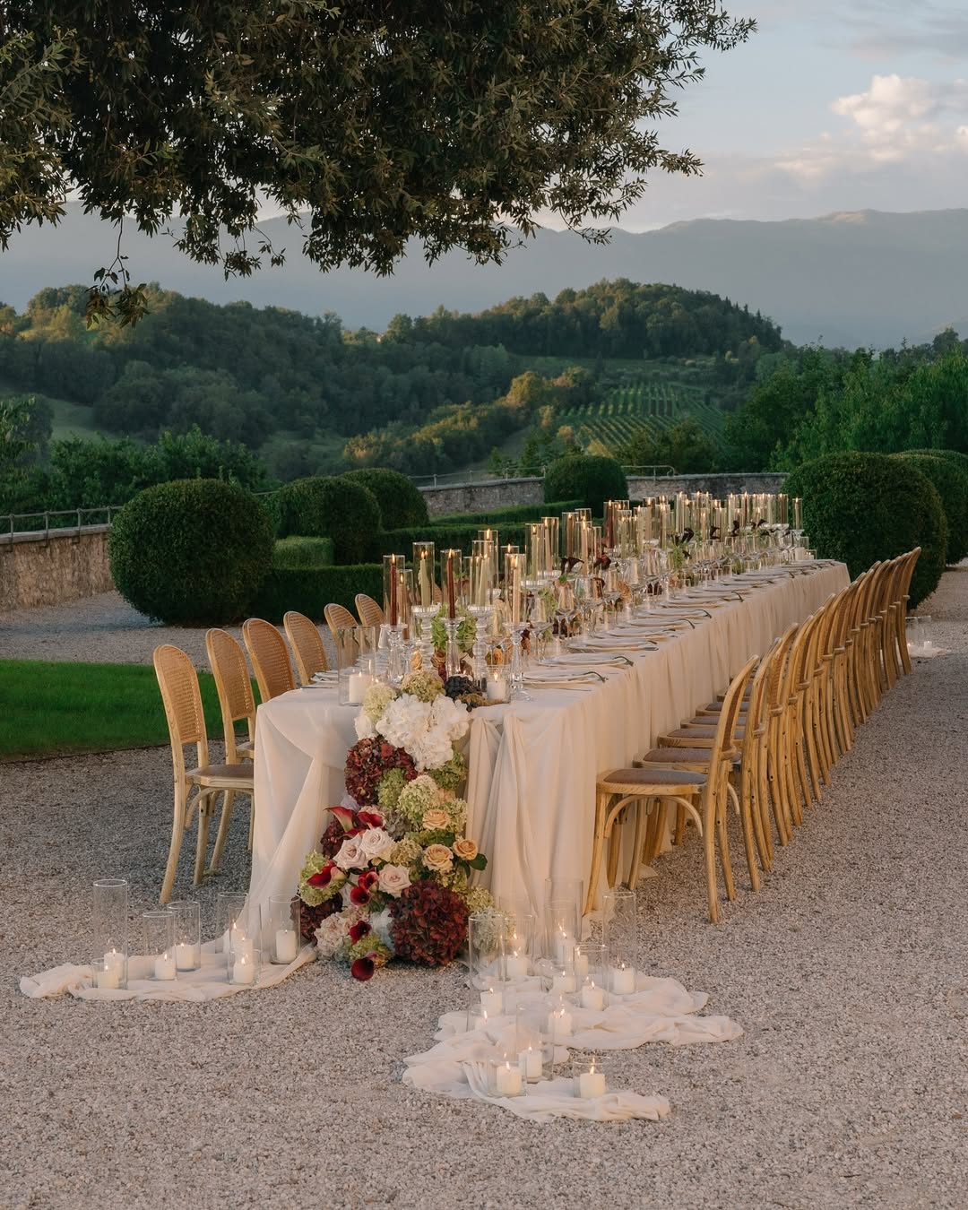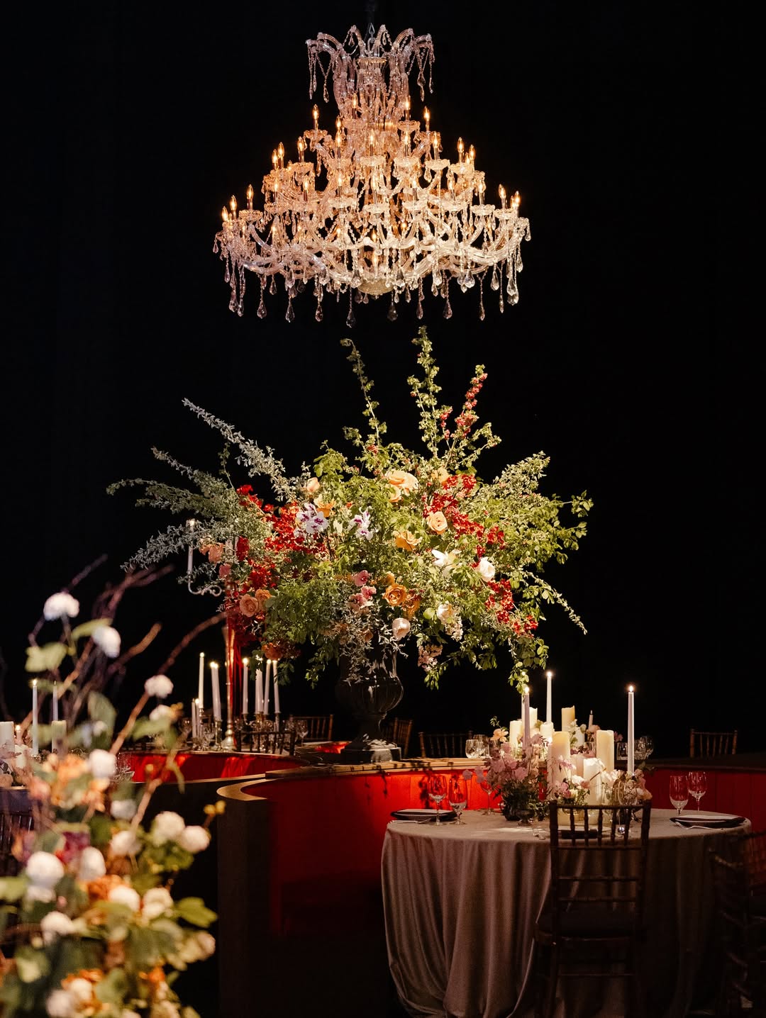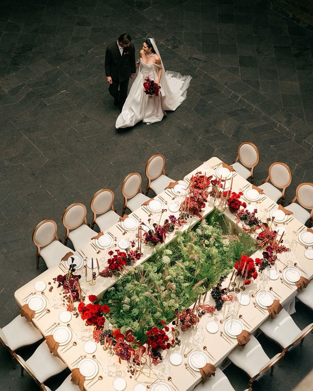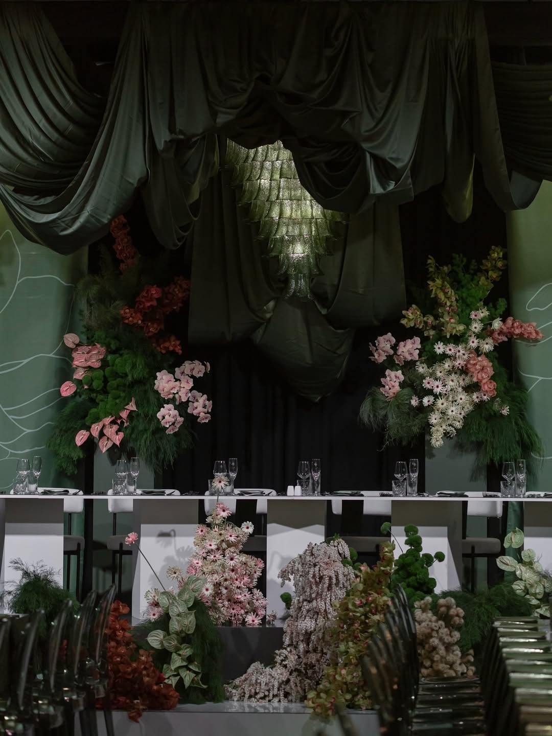 Floral centrepieces are going back to basics with a new look that's not tall and round like it used to be. Instead, they're all over the place, stretched out, or huddled together, making them look more like landscapes than arrangements. Low horizontal designs let guests see each other across the table while still looking good — think dense moss bases with low flowers and trailing vines that reach beyond the centrepiece. They work really well for long rectangular tables, where a continuous floral runner creates a cohesive look without blocking the view. Tall pieces are becoming popular again, but not in the usual way. Instead of making all the centrepieces the same height, designers are mixing heights to make the room look more interesting. One table might have a tall, eye-catching arrangement that stands three feet high, while the tables nearby have low groups of moss and flowers, making the whole room look like a landscape.