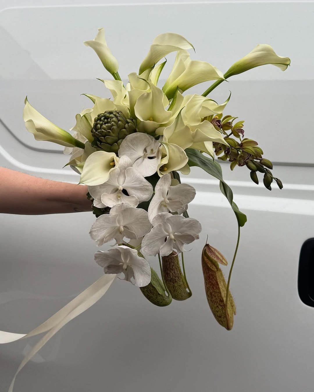 Texture is the main way organic florists express themselves, even more than color or the types of flowers used. Moss is used as a key part of the design, not just as something extra, with its soft surface giving the arrangement a solid, natural feel. Old branches and roots add a dramatic look, with their twisted shapes and rough surfaces giving depth that smooth flowers cannot. Thick, bold leaves like monstera, palm, or eucalyptus give the arrangement shape while keeping it looking wild and natural.