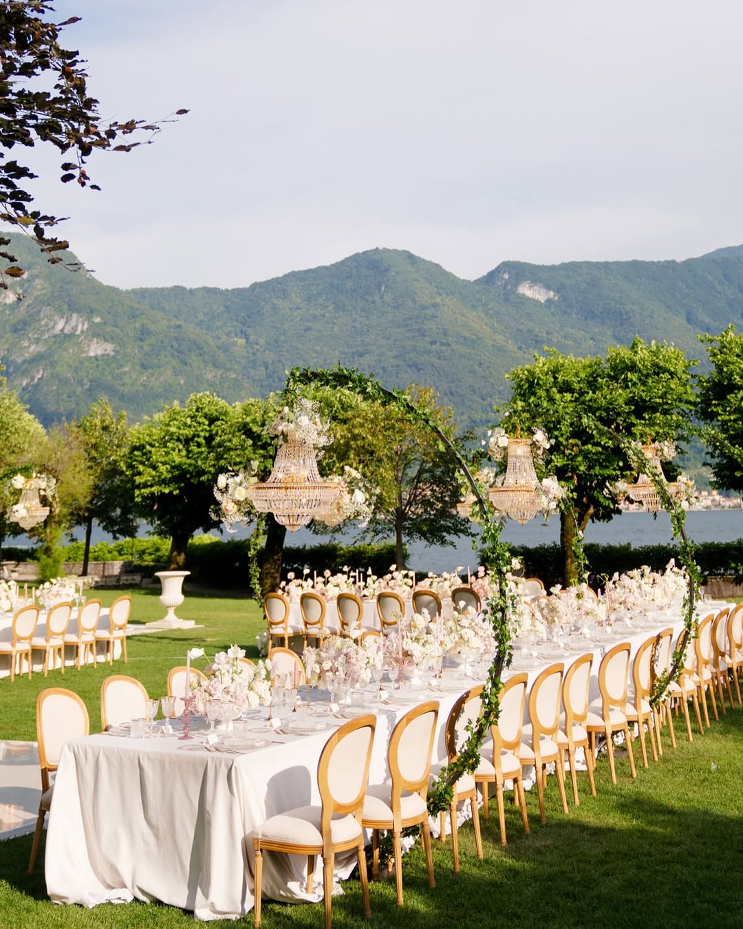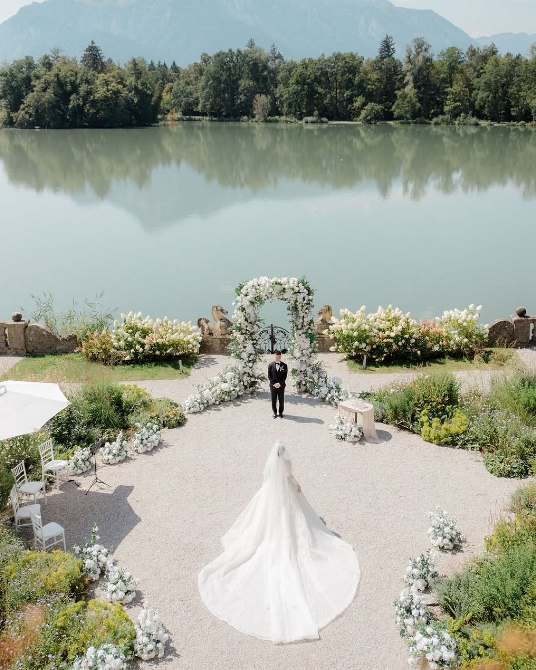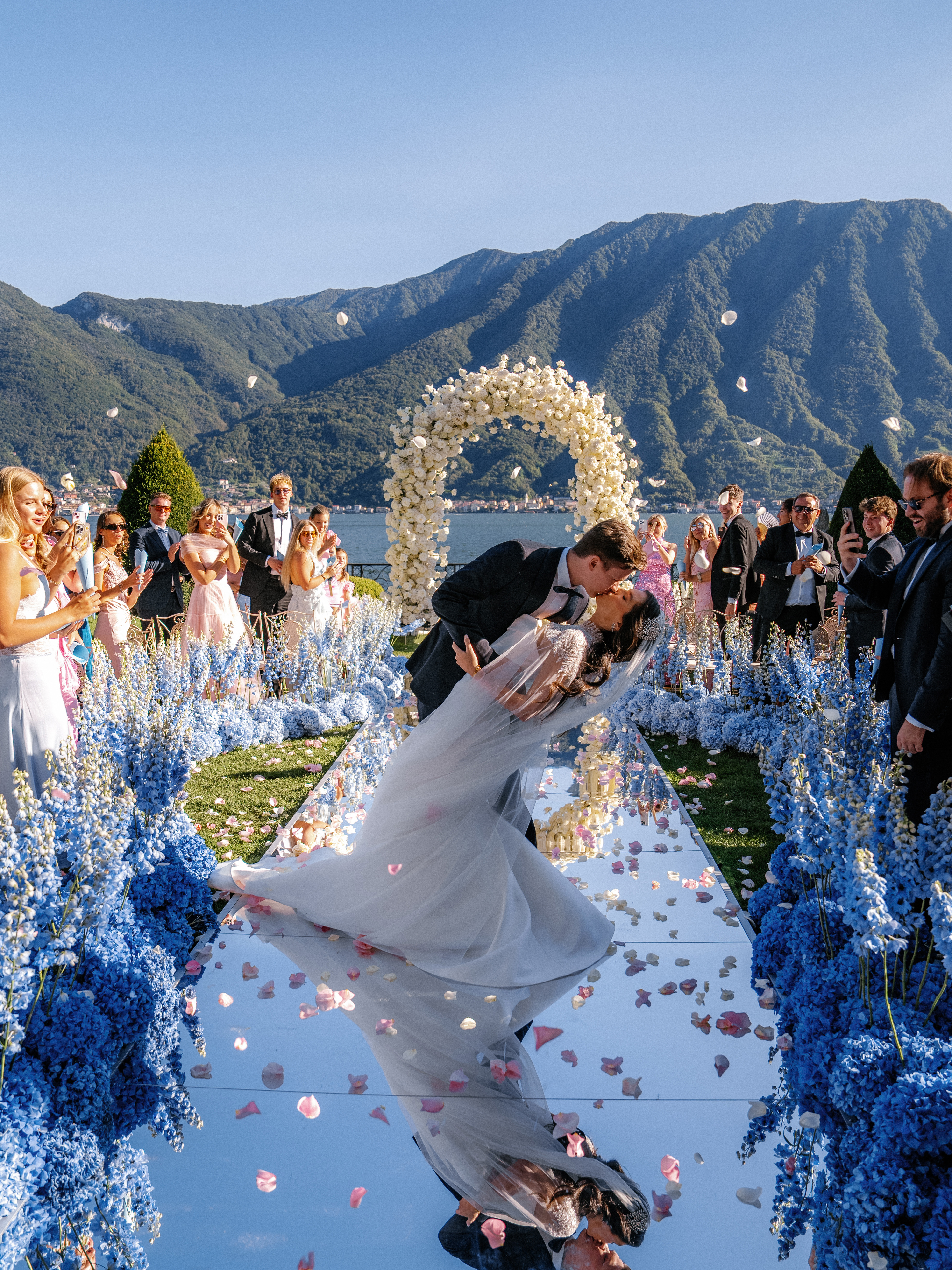 "I drew inspiration from the couple's striking baby blue eyes to create a showstopping ceremony that became the coup de théâtre of the entire event," recalls the Monaco-based planner. The resulting design featured an ombré pathway of blue hydrangeas and delphiniums leading to a suspended floral arch above a mirrored stage, creating reflections that seemed to merge with the lake itself.
