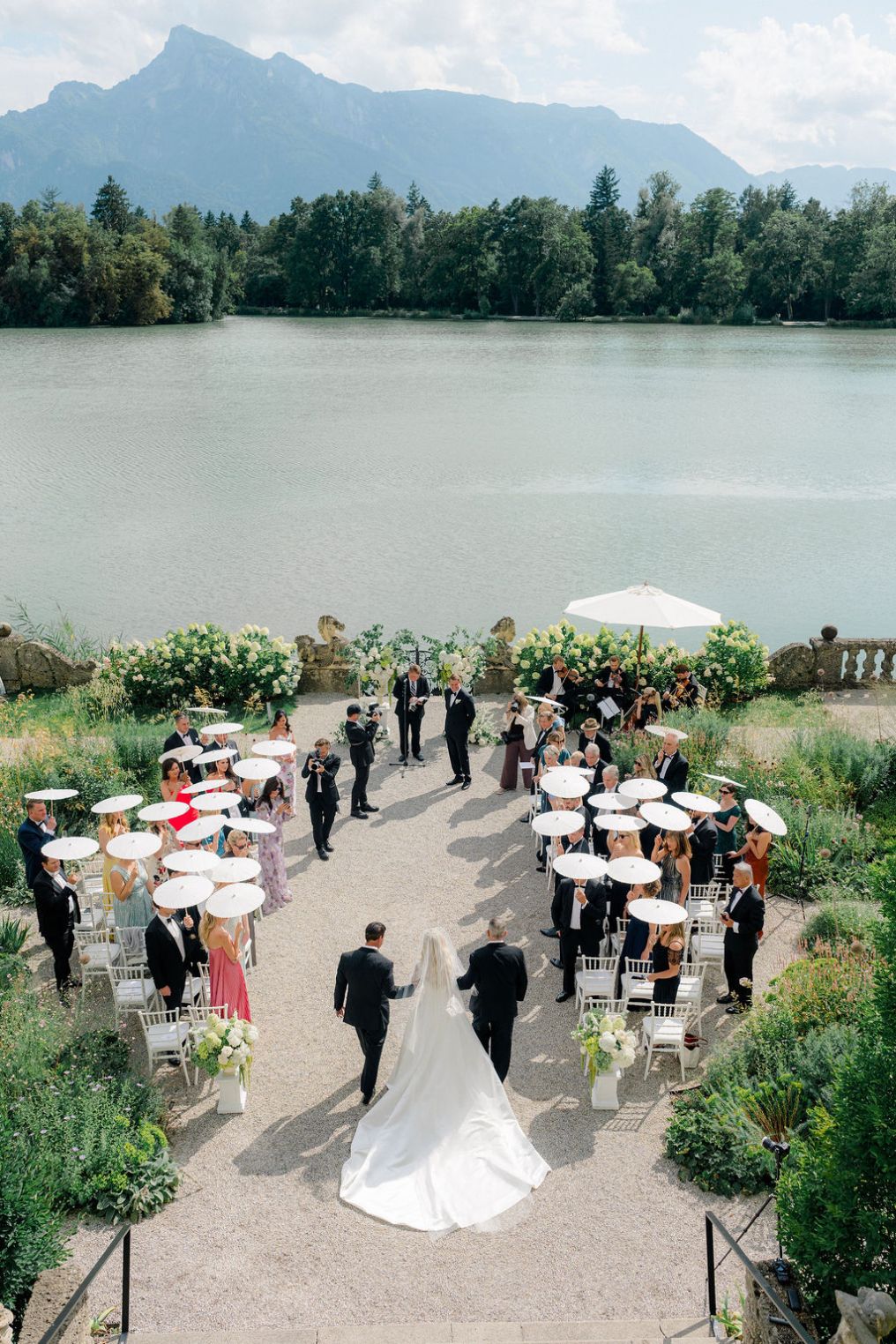 Breaking away from traditional layouts, Fine Events Vienna seated guests "in a circle around the couple to ensure every guest became a true participant in the emotional core of the event" at their Salzburg castle wedding. The bride's entrance became theatrical: "the bride made her entrance on a flower-adorned boat, gliding through the mist and light rain to the strains of 'Second Waltz'—a moment that felt like a real-life fairytale."
