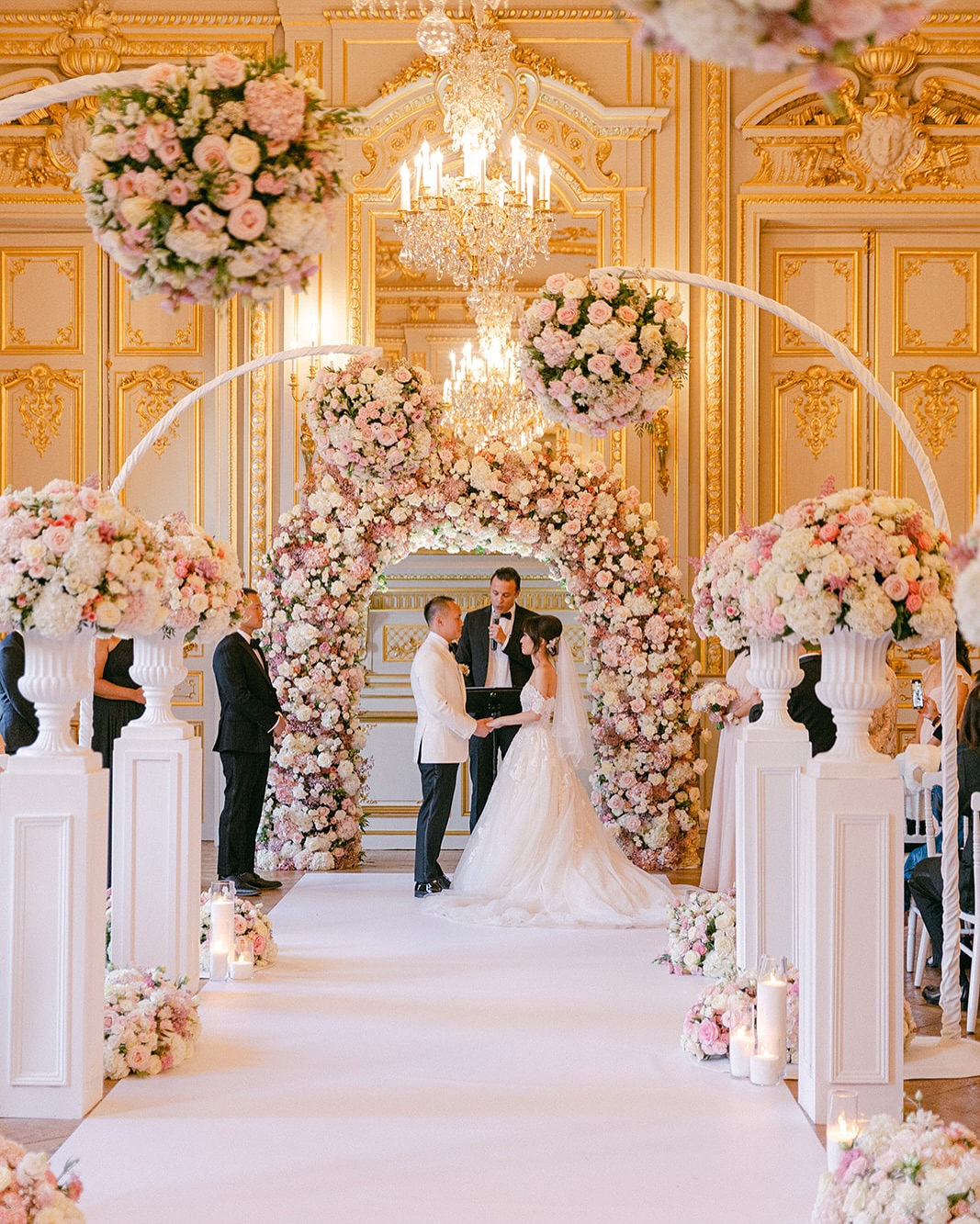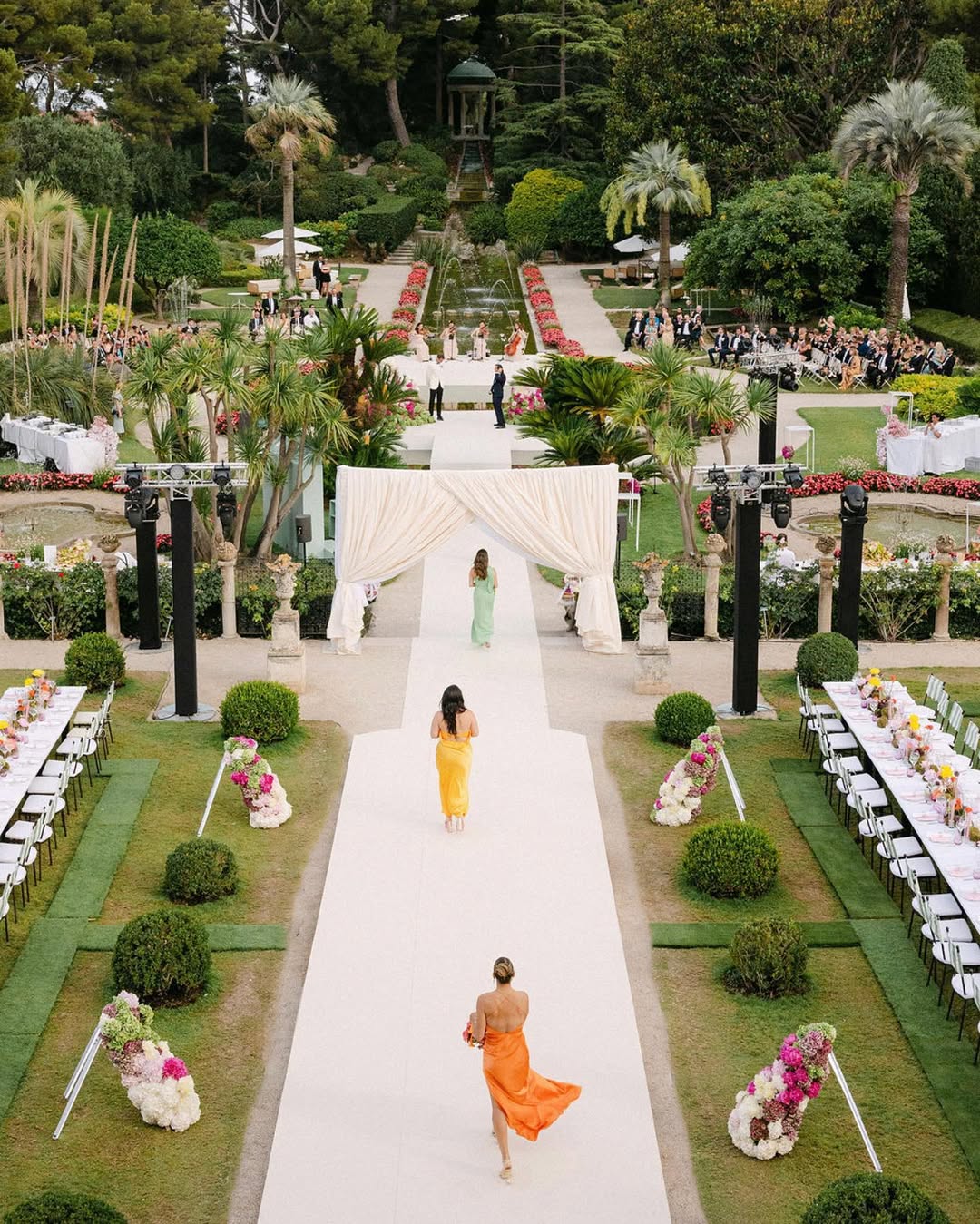 Dream Paris Wedding created environmental storytelling in a château celebration where "the ceremony took place in the formal gardens, framed by a bespoke floral 'mirror' installation designed to reflect the fountains behind the vows." This wasn't decoration—it was performance architecture that used reflections to multiply visual impact while creating symbolic depth.