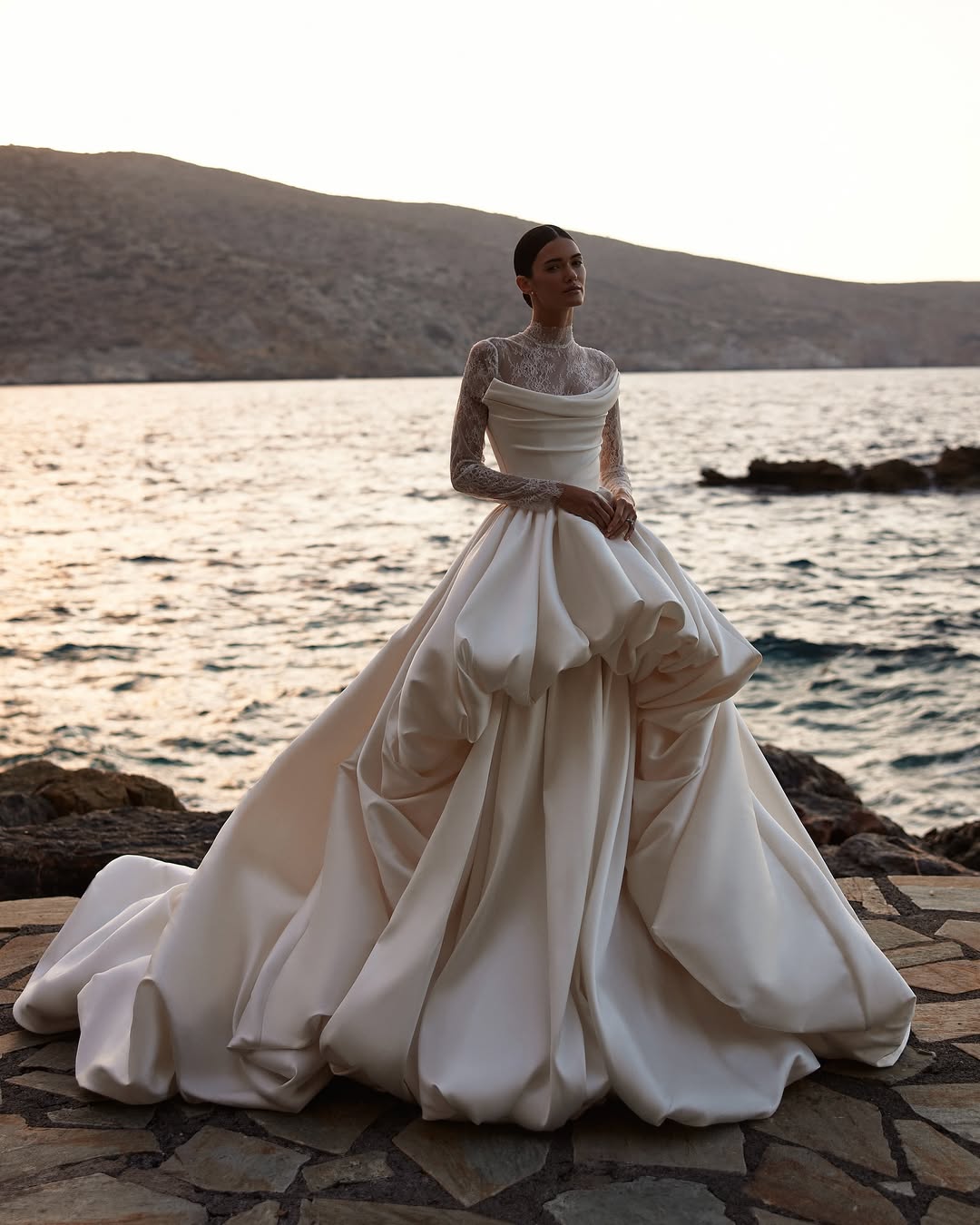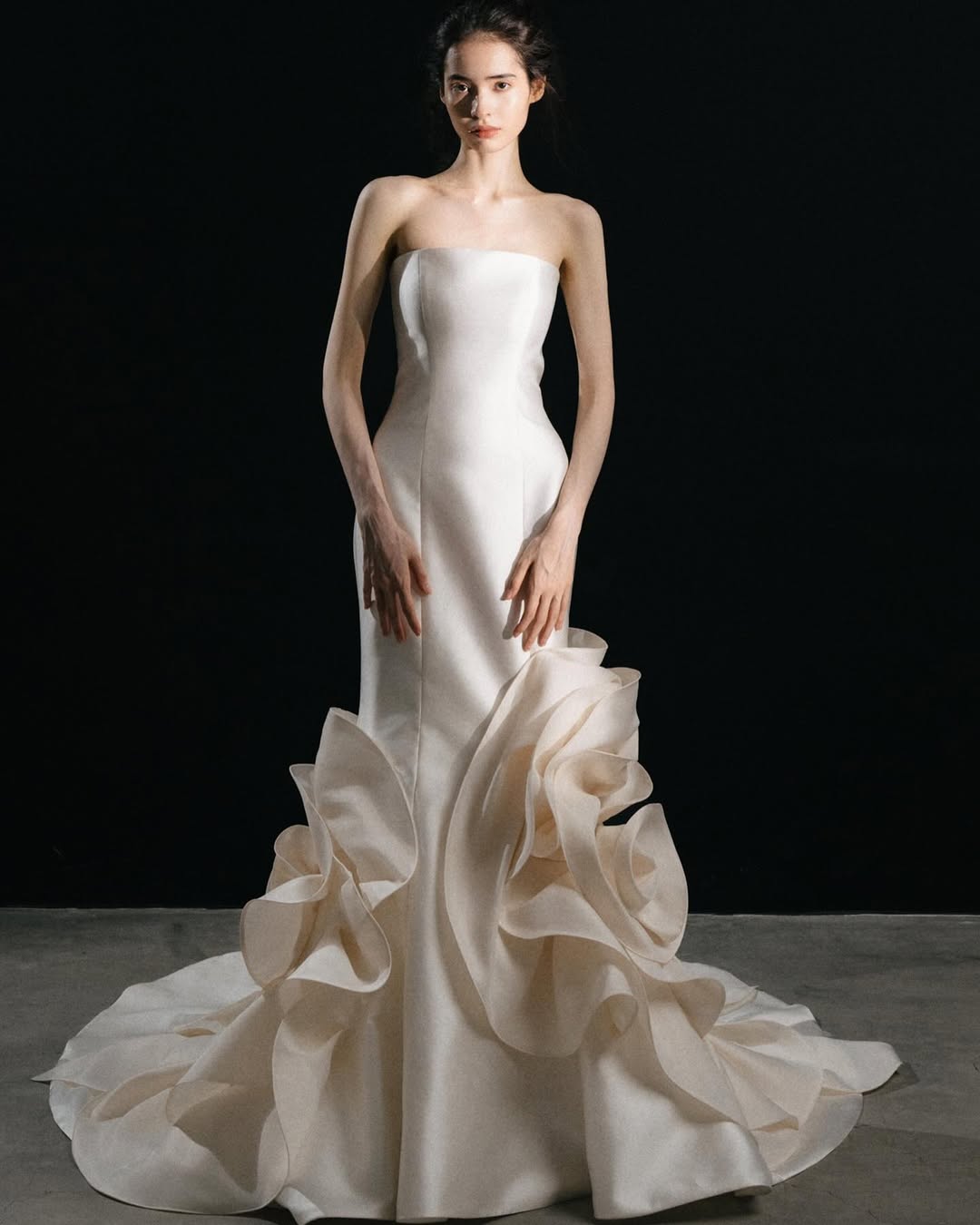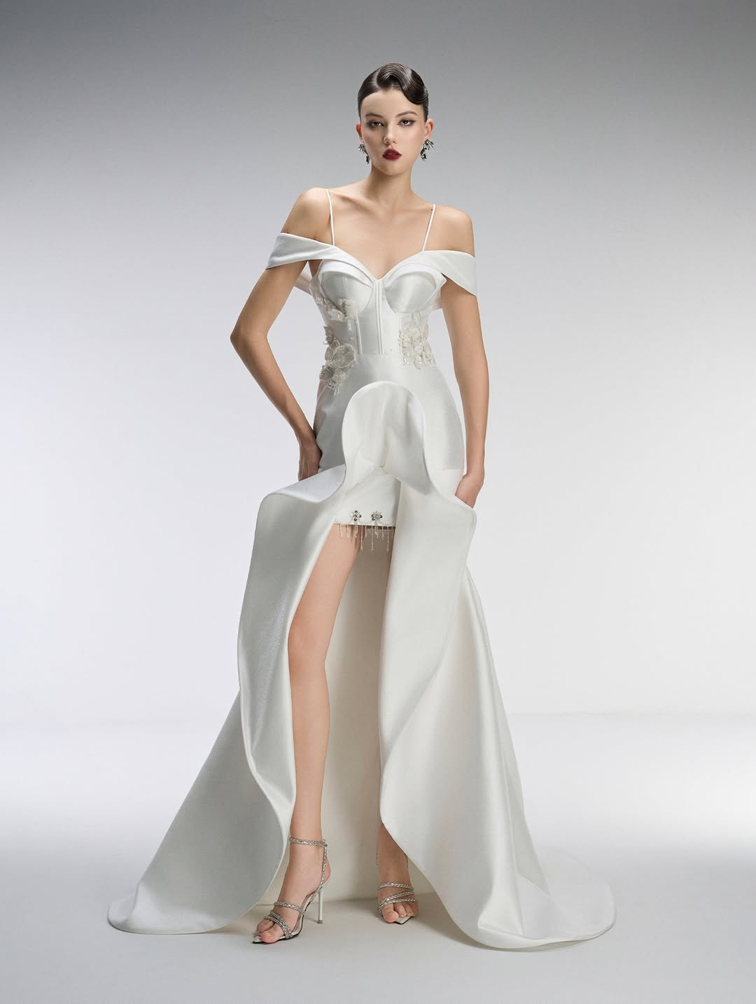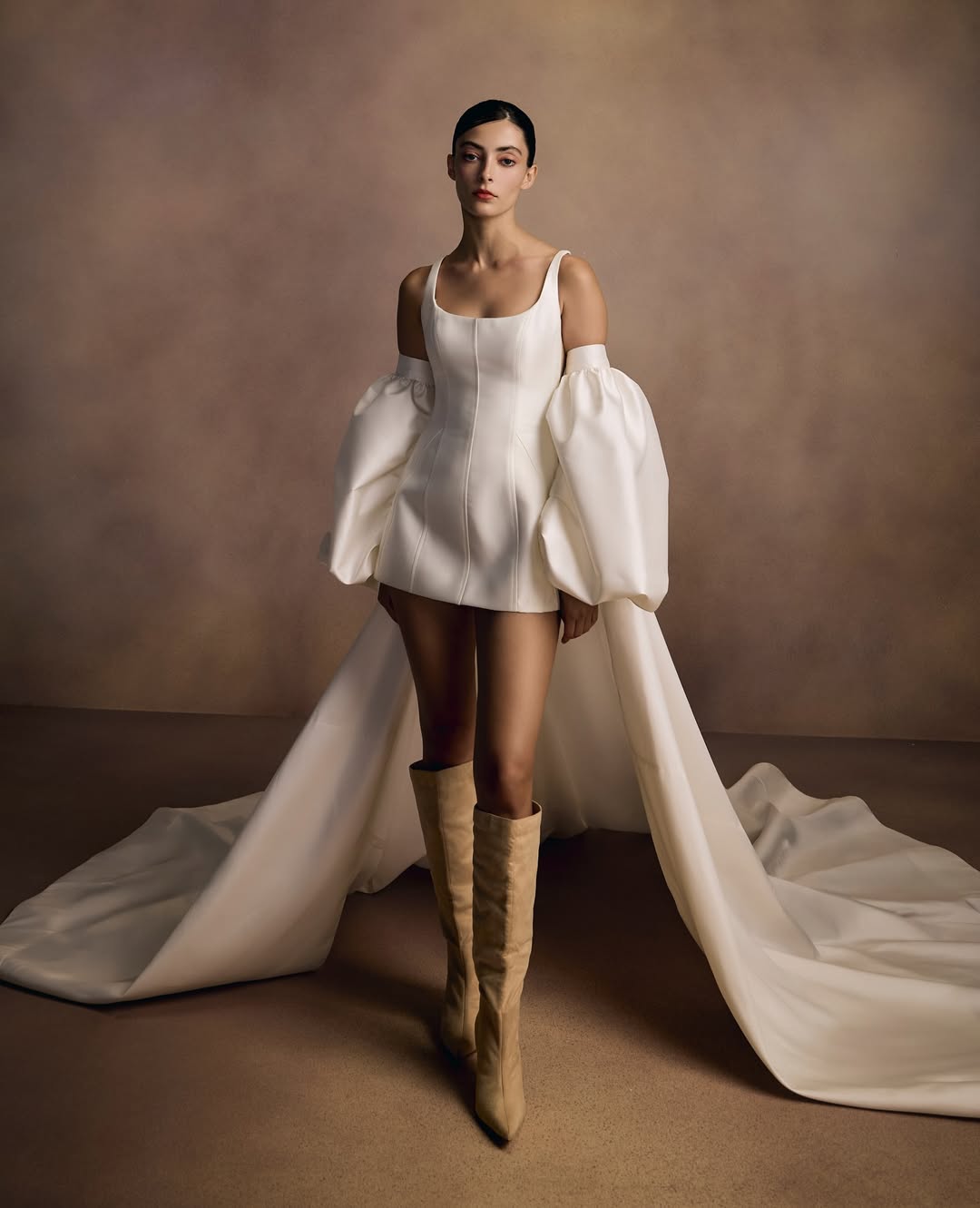 For brides who care about how their dress will look in photographs, this trend delivers. The strong silhouettes are clearly defined in photos, creating memorable shapes that don't rely on perfect lighting or angles to look striking. Whether captured in a grand ballroom or a minimalist gallery space, these gowns make an impact, proving that the most effective bridal statement is sometimes written in form, volume, and architectural intent.