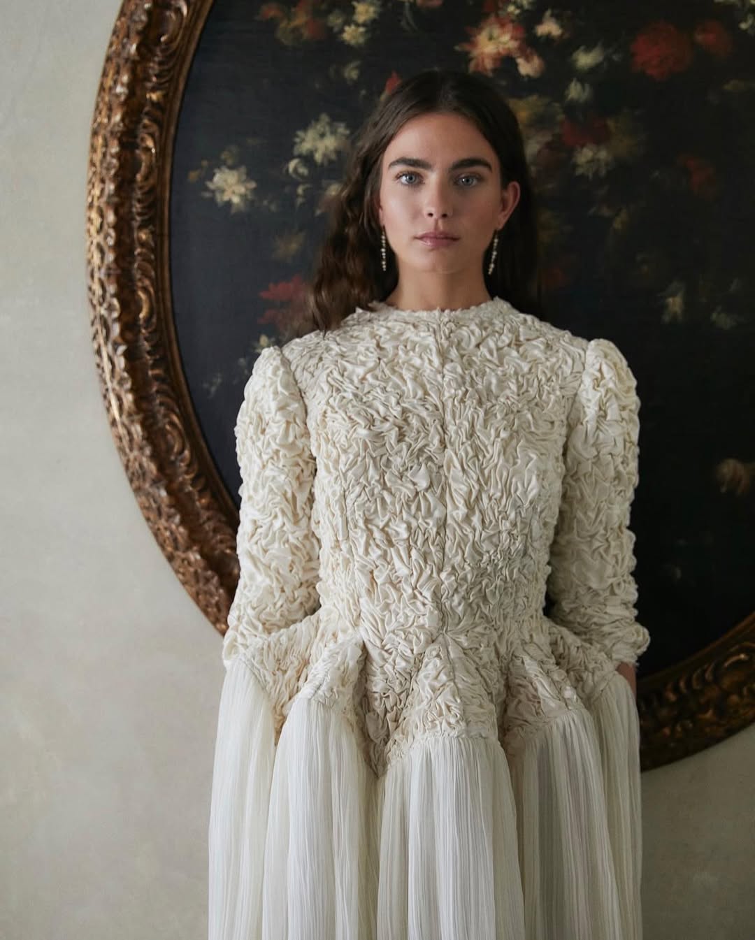 Couture draping techniques are essential for achieving these shapes. Designers don't just cut fabric — they manipulate it on dress forms, pinning, twisting, and layering it until it does something unexpected. This might involve heat-setting pleats to maintain sharp angles or using multiple layers of varying weights to create dimension. Some gowns incorporate hidden boning for a sculptural effect rather than structural support, creating ridges or channels that become an integral part of the design. Others use internal supports, such as hoops, wires, or rigid underlayers, that allow for dramatic overhangs, cantilevered volumes, or sections that appear to be floating. 3D forming techniques from haute couture are now also part of bridal fashion. These include shaping fabric while it is wet, stacking laser-cut pieces to create raised patterns, and adding hand-sculpted details that are made separately from the dress. The result is gowns that seem almost impossible; gowns that appear as if they shouldn't be able to keep their shape, yet they do. This combination of fragility and strength is what makes the sculptural wedding dress trend for 2026 so striking.