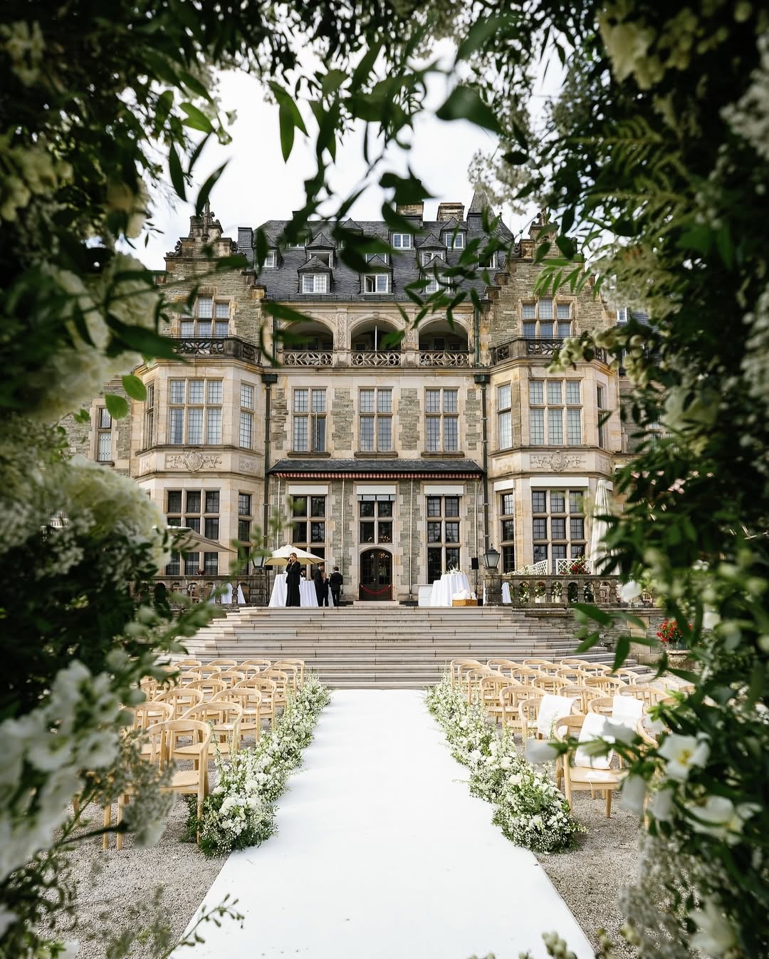 Inside, the château’s soul is pure artistry. Restored by the celebrated designer Jacques Garcia, its salons are lined with gilded mirrors, antique furnishings, and chandeliers that drip with light. The atmosphere makes you stand taller without even realizing it. Couples often begin their celebration with vows in the gardens or chapel, followed by champagne in the shade of century-old trees and dinner in the Orangerie, where the glow of the room meets the stars outside. Each part of the day unfolds like a film scene — refined, joyful, and utterly romantic.