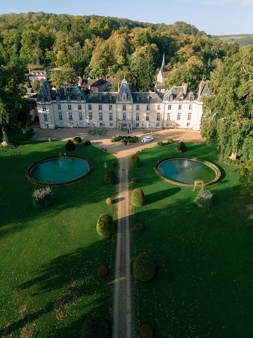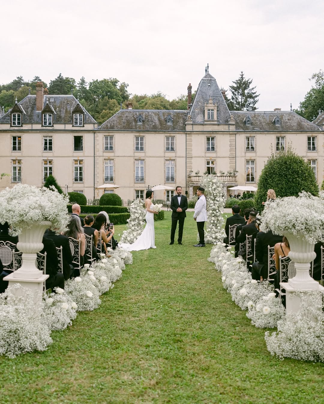The Château d’Aveny sits perfectly between country charm and elegance. The building is balanced, the lawns are neatly trimmed and stretch to the edge of the forest, and you have complete privacy, even though it is less than two hours from Paris. This makes your wedding feel like it is happening on your own country estate, even if you are only there for the weekend. Ceremonies happen on grass so neatly cut that it looks like velvet in photos, while receptions are held at long tables in the courtyard, surrounded by stone walls covered in climbing vines and soft lighting that makes everything look romantic.