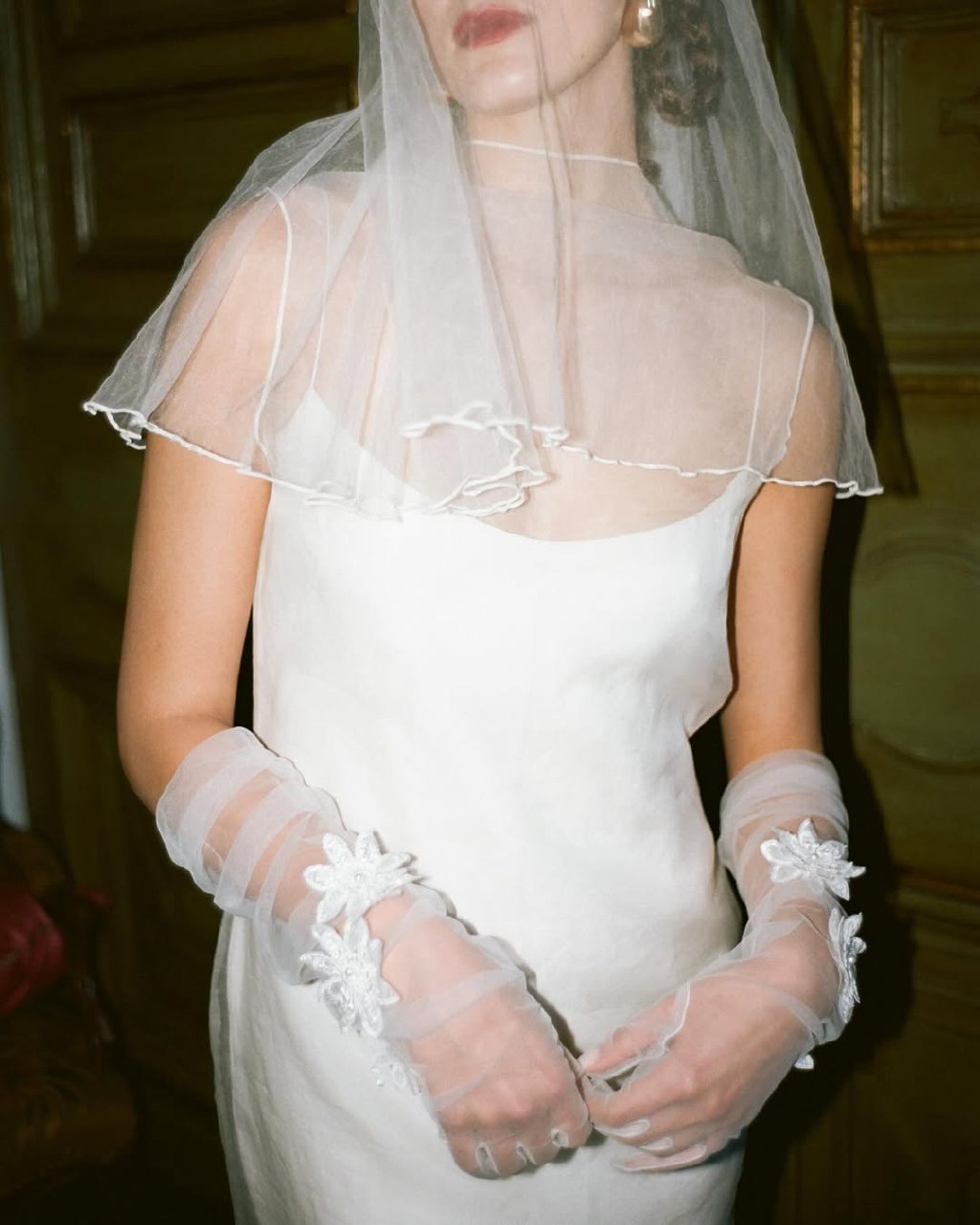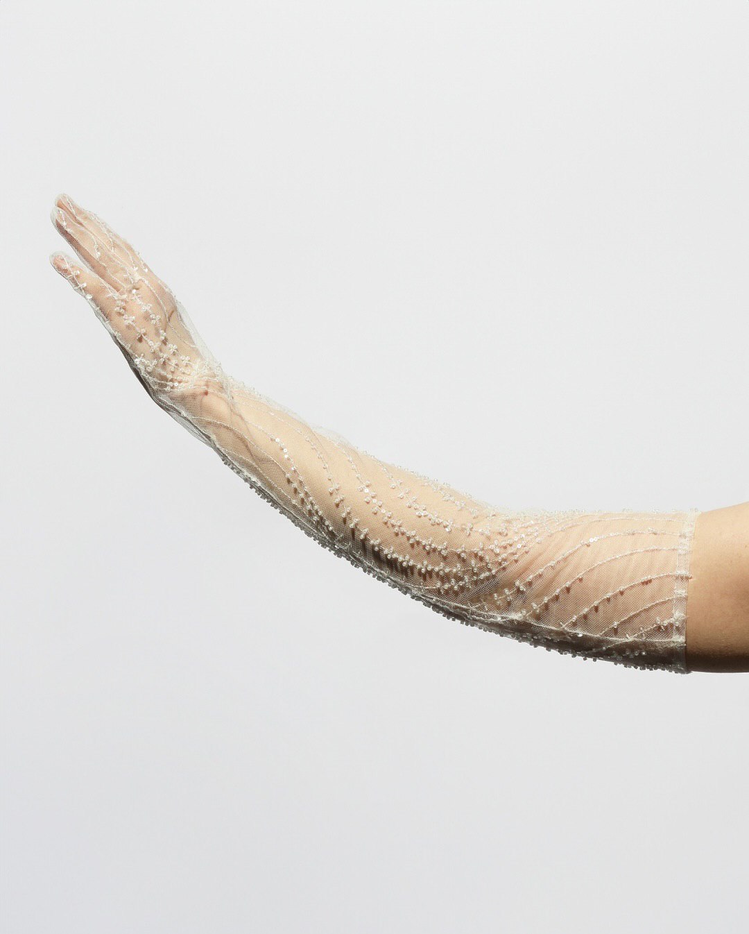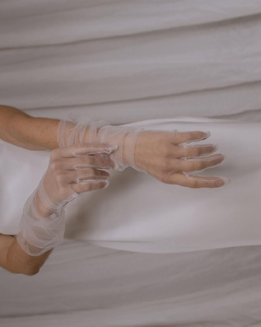 Minimalist bridal hand gloves strip away all excess, focusing entirely on fit, fabric, and form. These are gloves in their purest expression — sleek lines, impeccable construction, no embellishment. Usually made from silk or tulle — they prove that quality speaks louder than decoration. Perfect for modern brides with architectural gowns or sleek contemporary silhouettes, minimalist gloves create sophistication through restraint. This is a real elegance distilled to its essence.
