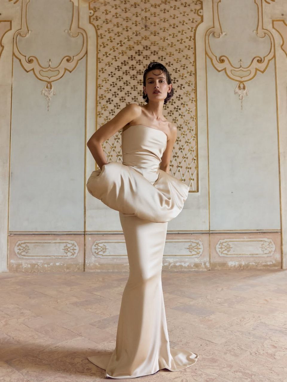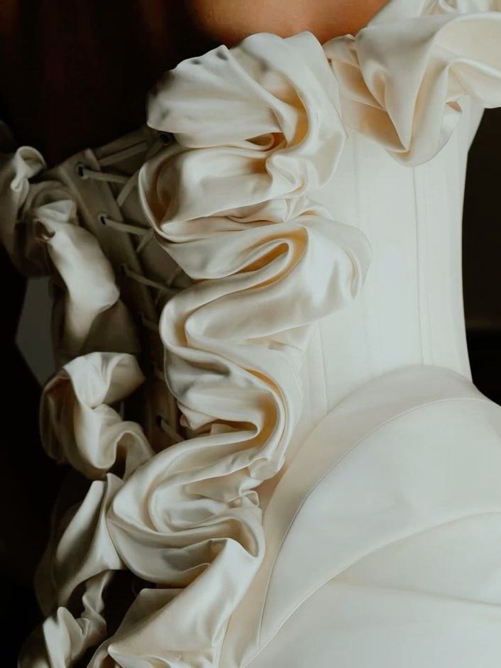 Satin has evolved far beyond your grandmother's wedding dress. The satin fabrics available for 2026 have incredible drape and movement that creates those viral dress moments you see all over social media. When you move, the fabric moves with you in the most gorgeous, fluid way. The key is choosing the right weight of satin for your silhouette and venue. Lighter satins work beautifully for destination weddings and create romantic, flowing looks. Heavier duchess satin gives you structure for dramatic ball gowns and formal church ceremonies.