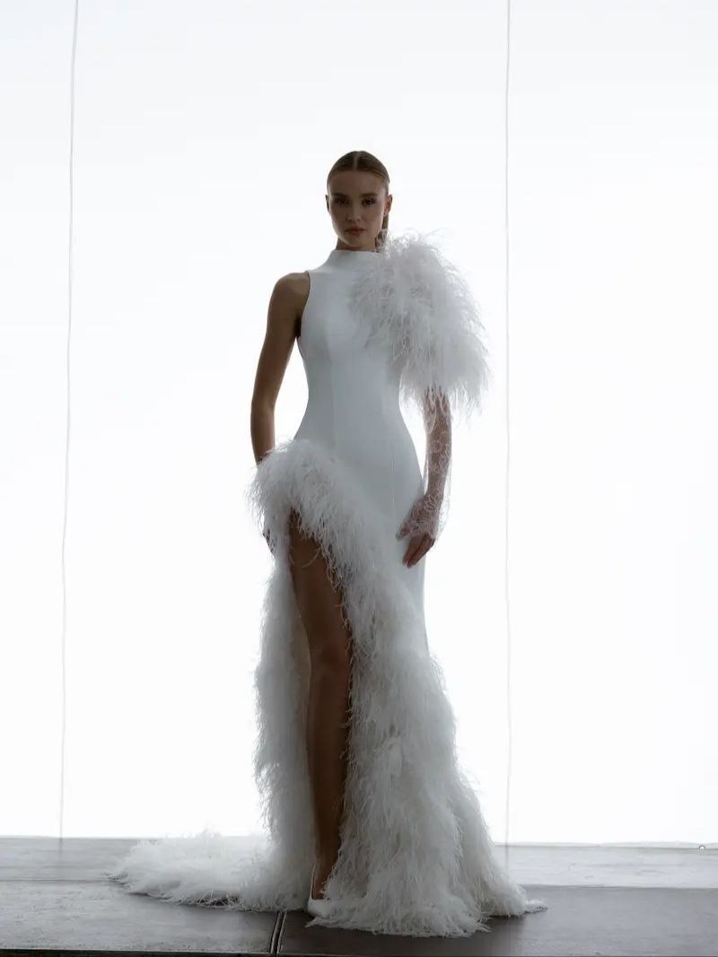 What makes feathers perfect for 2026 weddings is their versatility. You can go full drama with a cathedral train covered in feathers, or keep it subtle with just a hint of texture along your neckline. Either way, you'll have guests talking about your dress for years to come.