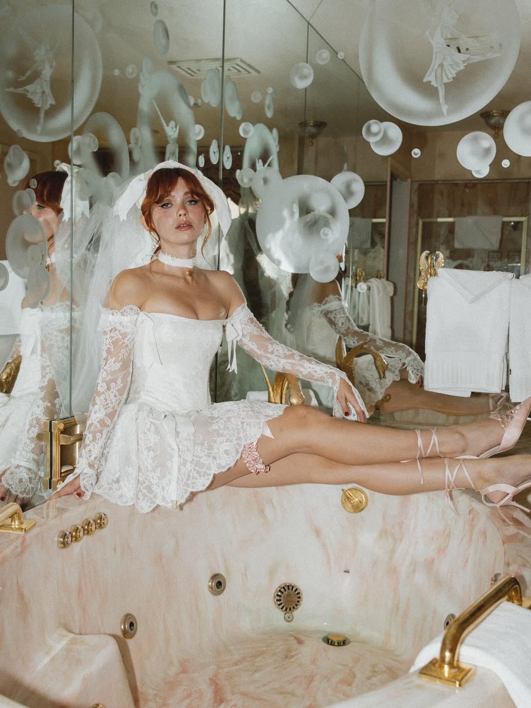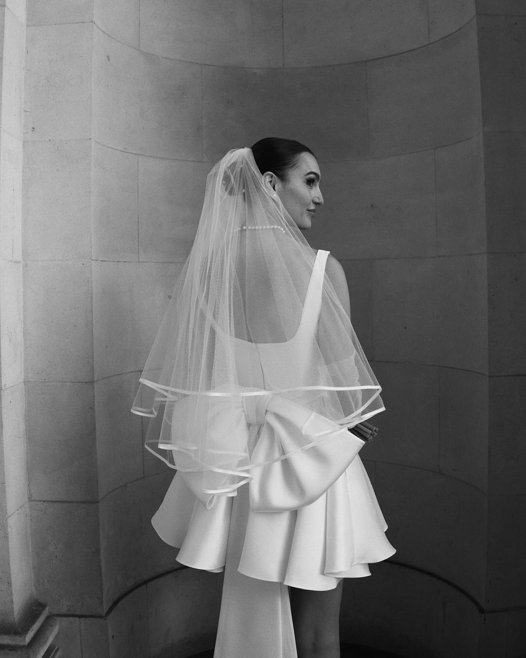 | Bubble Mini Dress | Shoulder-length veil; Birdcage veil | Sculptural heels; Satin pumps | Sleek bun; Metal or pearl earrings; Structured mini clutch |