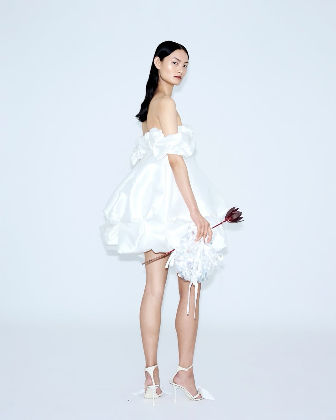 The bubble or boule shape has become the most recognizable sculpted style in short wedding dresses in 2026. It is both bold and playful, firm but soft. Picture a fitted top that flows into a rounded, cocoon-like skirt that narrows at the bottom, creating the classic balloon or bubble look. This style started in high fashion and is now popular in wedding dresses, offering something that long gowns cannot: a three-dimensional shape that looks like a piece of art in photos from every angle. A wedding mini dress in bubble style moves with you—the rounded shape sways and bounces as you walk, adding energy to your look. It feels joyful, perfect for a celebration, yet still elegant thanks to its careful design. The bubble style of 2026 is flexible. A simple satin bubble dress looks modern and clean. Add texture or decoration, and it becomes rich and romantic. The shape works just as well for the ceremony as for a mini bridal reception dress in the evening, giving you a dramatic "second look" when you want to dance without losing style. Designers create the bubble effect in different ways, like using hidden hoops, careful gathering and folding, or weighted hems that make the skirt curve in. The result is a short wedding dress that stands out for its shape, not just its decoration—the dress is like a piece of art you can wear and is also easy to celebrate in.