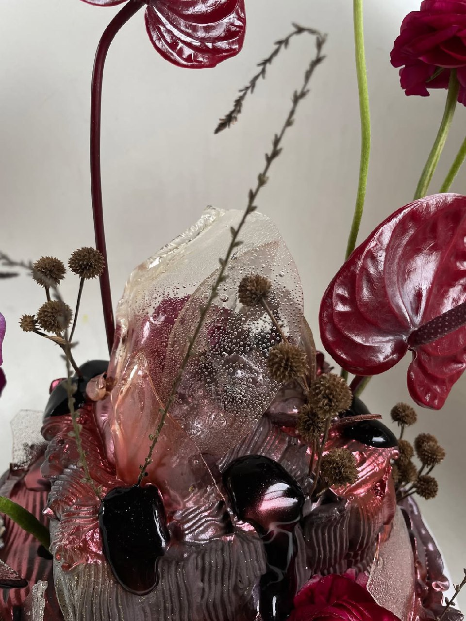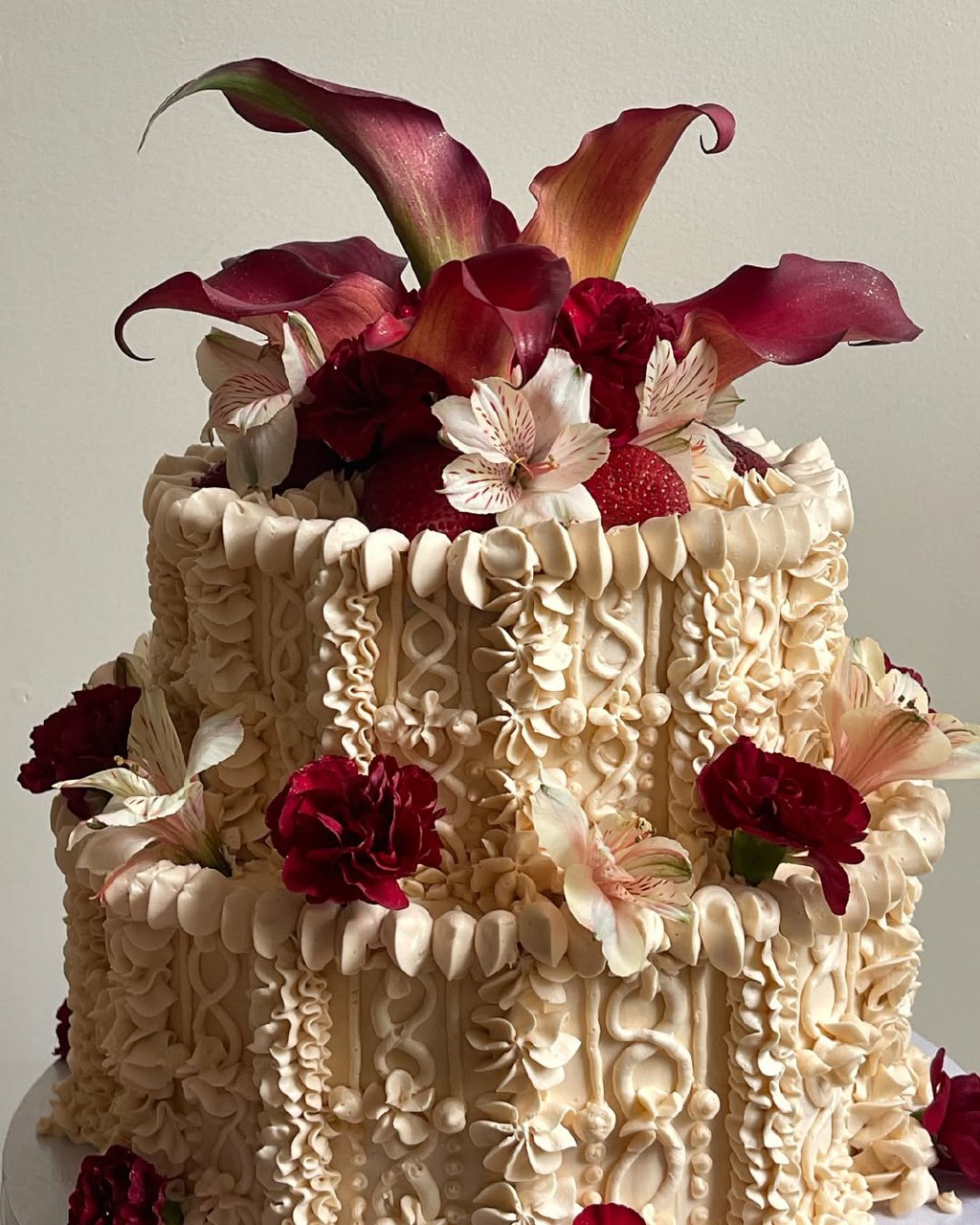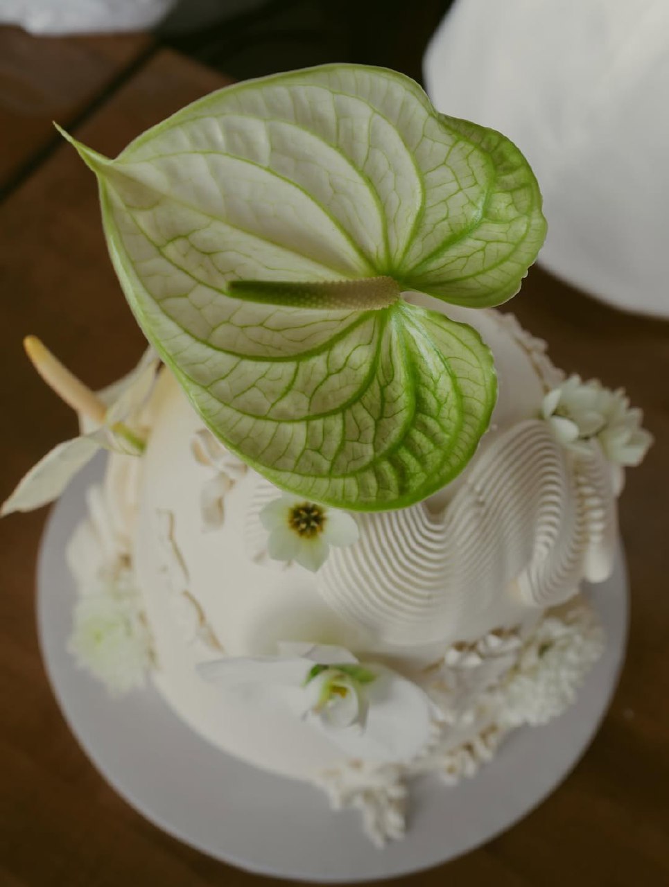 Anthuriums are the “it” bloom—sleek, architectural, and slightly subversive. Their glossy spathes catch light beautifully, giving your cake that gallery-piece presence without a riot of petals. One or two per tier is enough. Pair them with fondant’s clean edges or a stone-effect buttercream for quiet contrast.
