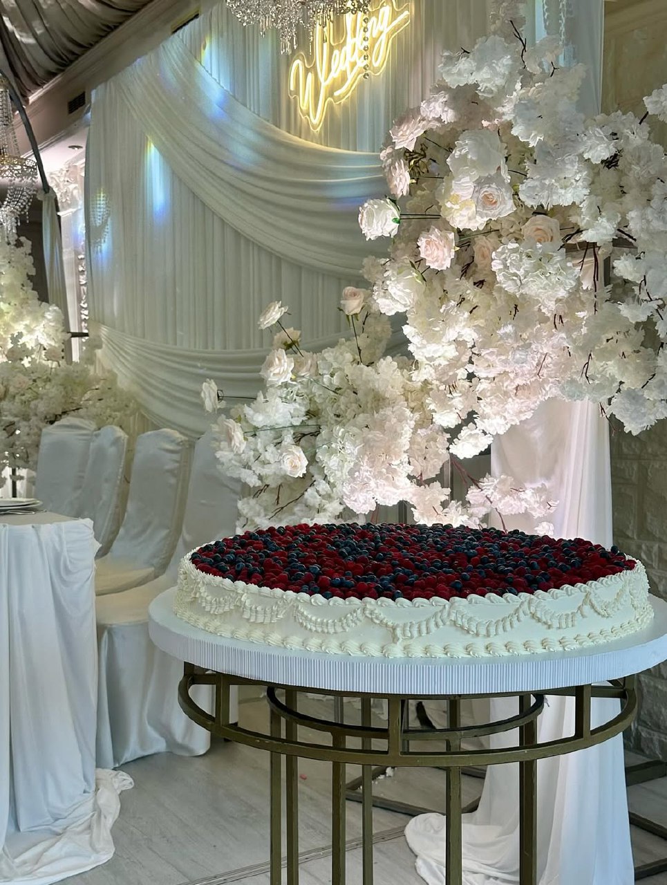 The beauty of berries is how they adapt to different moods. In an intimate outdoor wedding, a berry-topped cake becomes a playful centerpiece—easy to share, fun to cut, and photogenic in every candid moment (like when you can’t resist feeding each other with giggles). At a grand reception, the same concept transforms into something opulent: a large circular cake covered with layers of blueberries, raspberries, and blackberries framed by dramatic décor, showing that berries can be as luxurious as sugar flowers or gold leaf.