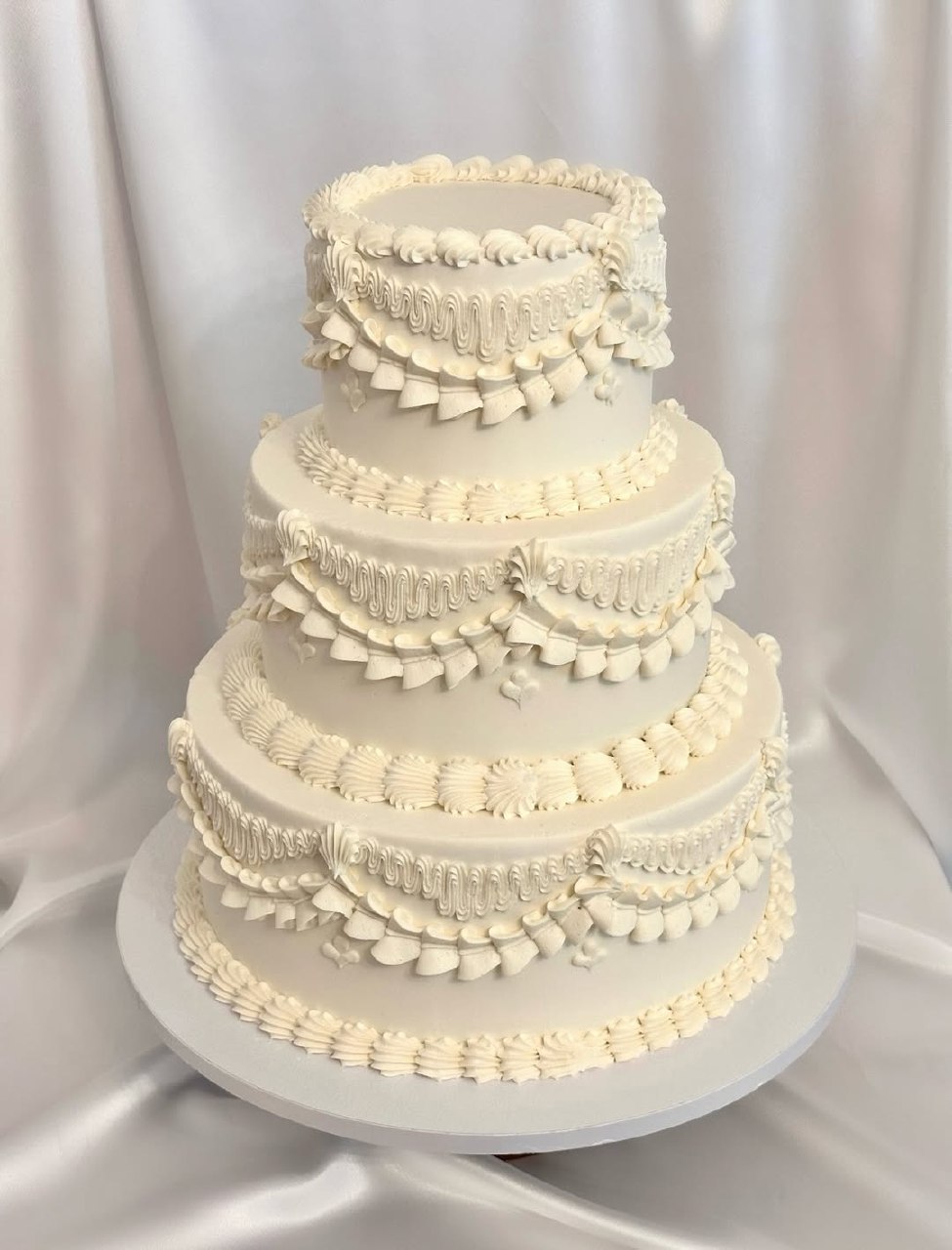 Skip heavy toppers; let the ruffles frame your cutting moment. If you adore bows, ask for a slim icing ribbon tied low on a single tier. For venues with gentle aesthetics—gardens, villas, minimalist lofts—this style meshes seamlessly with everything.