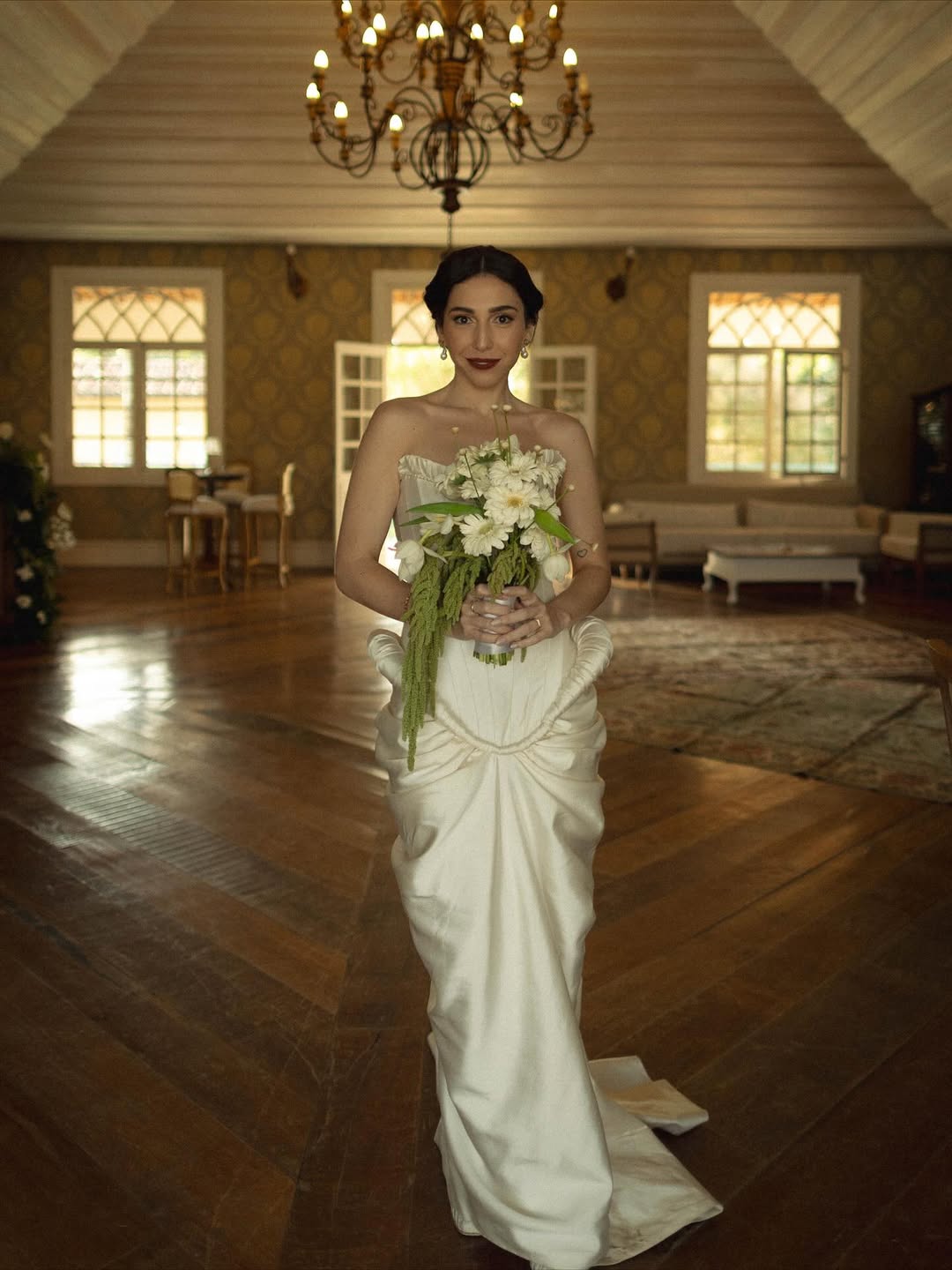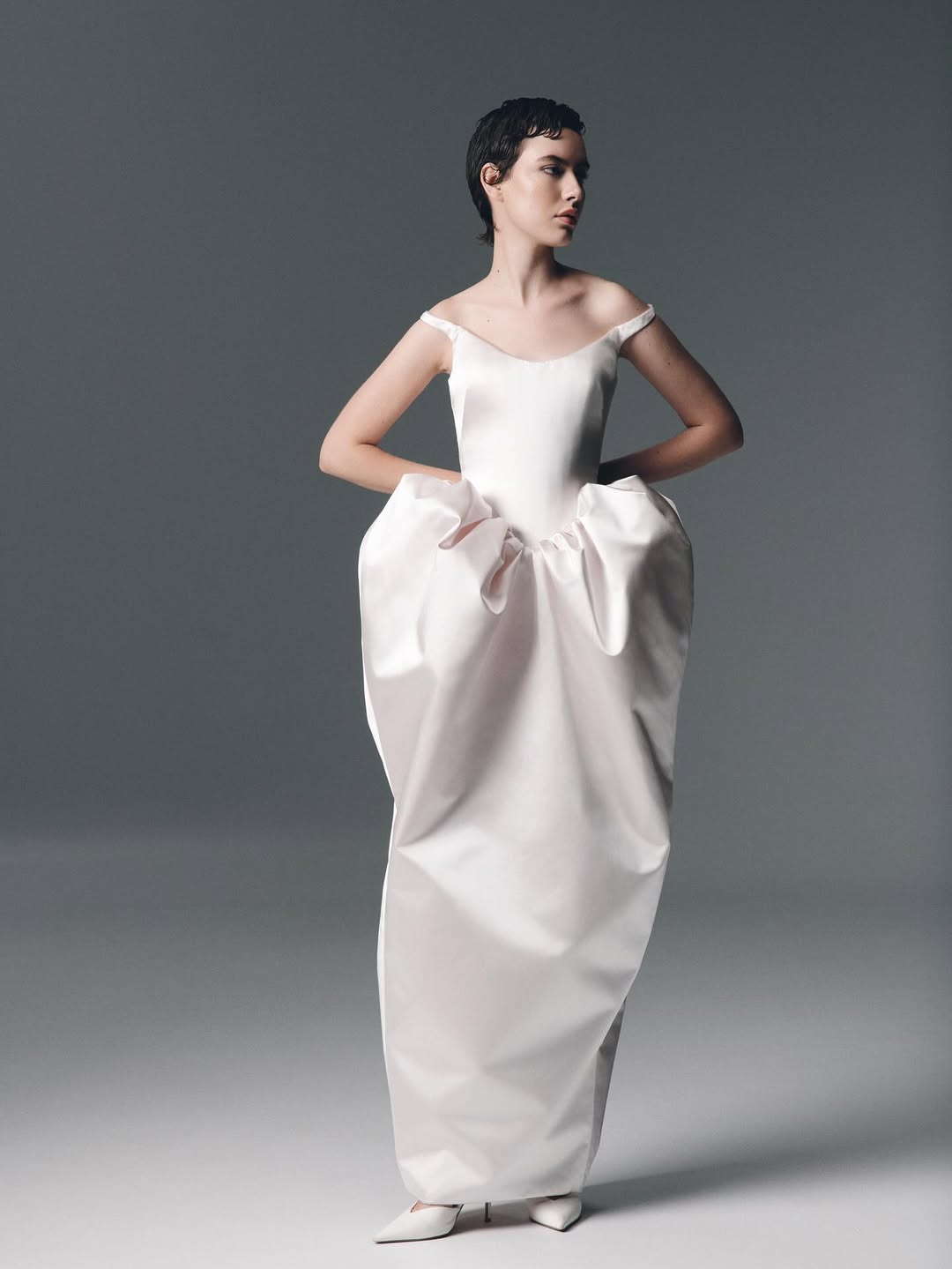 This version feels very much like the editor's opinion. The shape is still tulip-like, with a narrow bottom and a clear waist, but the size is kept under control, almost strict. There is no softness here, just clean, strong lines that look great in photos. These gowns often feature interesting details such as visible seams, uneven buttons, surprising cutouts, or bold necklines that complement the sharp look of the skirt. The straight-line tulip is perfect for modern places, like city lofts, art galleries, and impressive buildings, where the bride looks like a walking sculpture. It's bridal fashion all about style, where less is more, and the shape stands out.