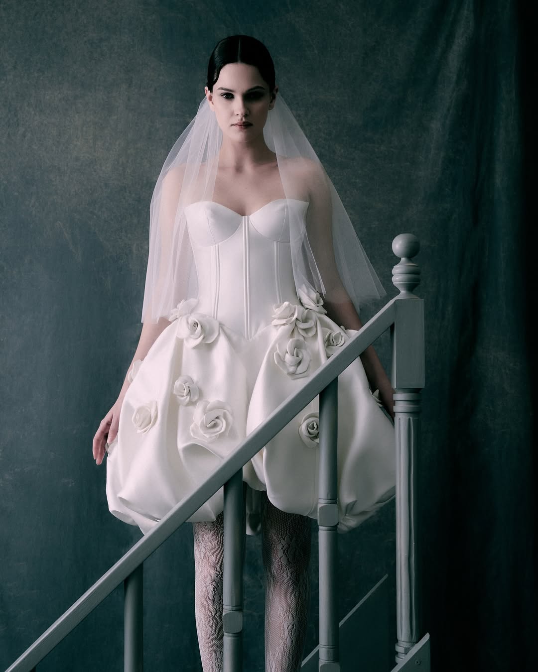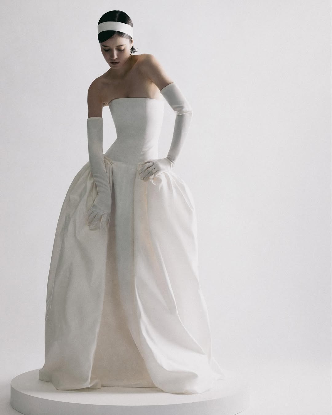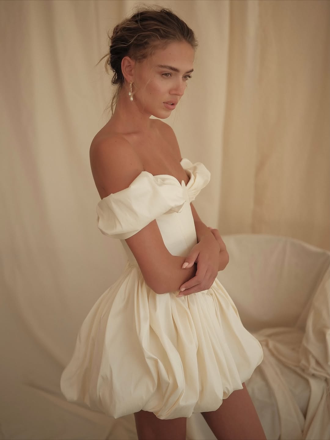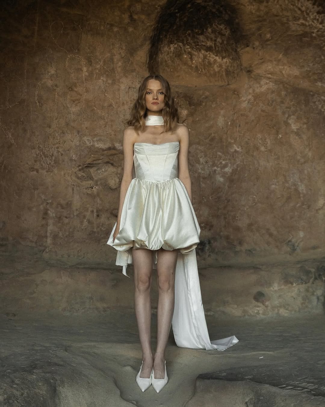 The short tulip shows off everything that's great about the shape, like the clear waist, the full skirt that looks like flower petals, and the bold style, and turns it into something that feels young, fresh, and different. These aren't your usual courthouse dresses; they're stylish short gowns that really stand out. Picture a fitted top that opens into a rounded hem with sharp folds that make that classic tulip shape. Picture firm organza in a rounded style that ends at mid-thigh, letting you move easily and giving you a very modern look. There's no doubt about it, there's a clear Y2K influence here. That early 2000s love of bold, structured mini dresses is being reimagined for fancy weddings. But these aren't your typical costumes or old styles; they're dresses that really get the shape, fit, and show off your legs just right. They work really well for: