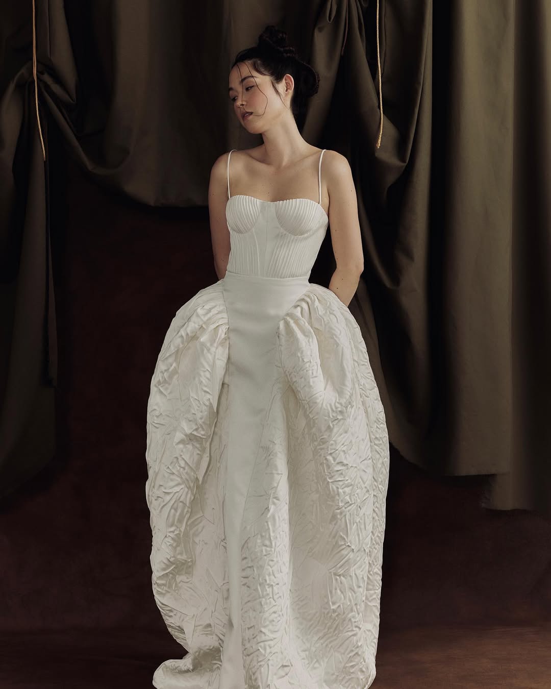 If you like bold, sculpted styles, you'll love the draped and layered designs. They're very dramatic and look like runway pieces. This is where designers really get creative, turning fabric into something completely different by twisting, folding, tying, and layering materials into detailed shapes that look more like wearable art than regular wedding dresses.